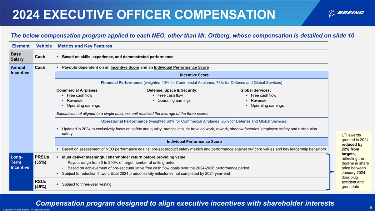 ROBUST SHAREHOLDER OUTREACH PROGRAM 1 2024 Shareholder Outreach and Engagements Total Engaged Total Contacted Total Director Engaged ~100 Additional shareholder meetings in 2024 among the CEO, CFO ~49% ~45% ~43% and/or business unit CEOs in one- on-one or small-group meetings to of outstanding shares of outstanding shares of outstanding shares discuss business, financial performance, strategy and other topics of interest to investors Recent Actions Informed by Shareholder Feedback ü Helped develop list of key skills and expertise necessary for new CEO ü Enhanced proxy disclosure of CEO succession process ü Disclosed safety updates on our website in January 2025, showing progress on our Safety & Quality Plan, delivering on our commitment to providing a one-year follow-up from the January 2024 door plug accident ü Adopted a single enterprise incentive score for the 2025 annual incentive plan to promote alignment on operational priorities, accountability and a culture of unity ü Enhanced proxy disclosure regarding human capital management and culture ü Continued robust disclosures on safety, sustainability, and political advocacy topics 1 Percentages calculated based on shares outstanding as of December 31, 2024 Committed to regularly and proactively engaging with shareholders 7 Copyright © 2025 Boeing. All rights reserved.