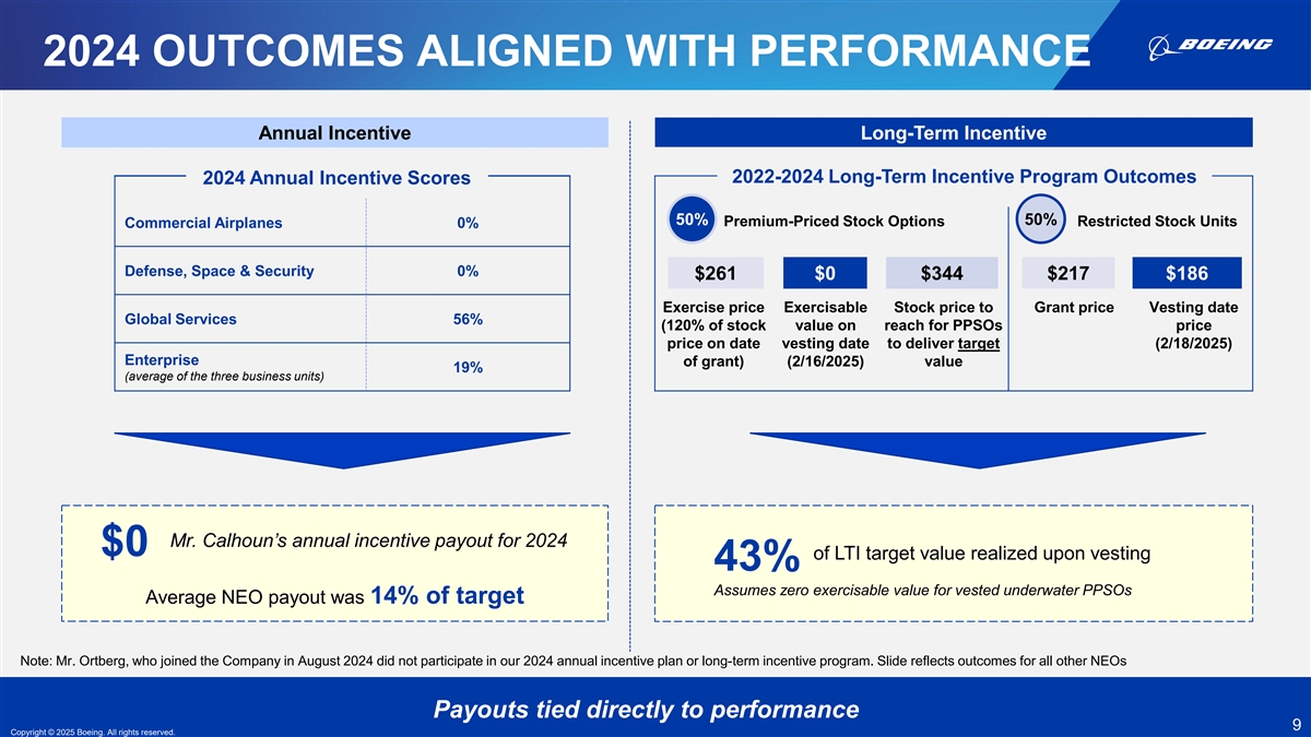 2024 EXECUTIVE OFFICER COMPENSATION The below compensation program applied to each NEO, other than Mr. Ortberg, whose compensation is detailed on slide 10 Element Vehicle Metrics and Key Features Base Cash§ Based on skills, experience, and demonstrated performance Salary § Payouts dependent on an Incentive Score and an Individual Performance Score Annual Cash Incentive Incentive Score Financial Performance (weighted 40% for Commercial Airplanes, 75% for Defense and Global Services) Commercial Airplanes: Defense, Space & Security: Global Services: § Free cash flow § Free cash flow § Free cash flow § Revenue § Operating earnings § Revenue § Operating earnings § Operating earnings Executives not aligned to a single business unit received the average of the three scores Operational Performance (weighted 60% for Commercial Airplanes, 25% for Defense and Global Services) § Updated in 2024 to exclusively focus on safety and quality; metrics include traveled work, rework, shadow factories, employee safety and distribution safety LTI awards granted in 2024 Individual Performance Score reduced by § Based on assessment of NEO performance against pre-set product safety metrics and performance against our core values and key leadership behaviors 22% from targets, Long- PRSUs § Must deliver meaningful shareholder return before providing value reflecting the Term (55%) - Payout range from 0 to 200% of target number of units granted decline in share Incentive price between - Based on achievement of pre-set cumulative free cash flow goals over the 2024-2026 performance period January 2024 § Subject to reduction if two critical 2024 product safety milestones not completed by 2024 year-end door plug RSUs accident and § Subject to three-year vesting grant date (45%) Compensation program designed to align executive incentives with shareholder interests 8 Copyright © 2025 Boeing. All rights reserved.