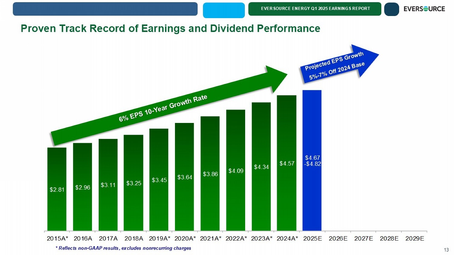 EVERSOURCE ENERGY Q1 2025 EARNINGS REPORT Safe Harbor Statement 1 All per - share amounts in this presentation are reported on a diluted basis. The only common equity securities that are publicly traded are common shares of Eversource Energy. The first quarters 2025 and 2024 earnings discussion includes a financial measure, EPS by business, that is not recognized under generally accepted accounting principl es (non - GAAP), and is calculated by dividing the net income attributable to common shareholders of each business by the weighted average diluted Eversource Energy common shares outstanding for the period. The earnings and EP S of each business do not represent a direct legal interest in the assets and liabilities of such business, but rather represent a direct interest in Eversource Energy’s assets and liabilities as a whole. Full year 20 24 earnings discussion includes a non - GAAP financial measure referencing earnings and EPS excluding a loss on the sales of the offshore wind equity method investments and a loss on the pending sale of the Aquarion w ate r distribution business. Eversource Energy uses these non - GAAP financial measures to evaluate and provide details of earnings results by business and to more fully compare and explain results without including the se items. This information is among the primary indicators management uses as a basis for evaluating performance and planning and forecasting of future periods. Management believes the impacts of the loss on the off sho re wind investments and the loss on the pending sale of the Aquarion water distribution business are not indicative of Eversource Energy's ongoing costs and performance. Management views these charges as not direc tly related to the ongoing operations of the business and therefore not an indicator of baseline operating performance. Due to the nature and significance of the effect of these items on net income attributable to co mmon shareholders and EPS, management believes that the non - GAAP presentation is a more meaningful representation of Eversource Energy's financial performance and provides additional and useful information to read ers of this report in analyzing historical and future performance of the business. These non - GAAP financial measures should not be considered as alternatives to reported net income attributable to common shareholders o r E PS determined in accordance with GAAP as indicators of Eversource Energy's operating performance. Eversource Energy makes statements concerning its expectations, beliefs, plans, objectives, goals, strategies, a ssu mptions of future events, future financial performance or growth and other statements that are not historical facts. These statements are “forward - looking statements” within the meaning of U. S. federal securities laws. Re aders can generally identify these forward - looking statements through the use of words or phrases such as “estimate,” “expect,” “pending,” “anticipate,” “intend,” “plan,” “project,” “believe,” “forecast,” “would,” “ sho uld,” “could” and other similar expressions. Forward - looking statements involve risks and uncertainties that may cause actual results or outcomes to differ materially from those included in the forward - looking statements. Forward - lo oking statements are based on the current expectations, estimates, assumptions or projections of management and are not guarantees of future performance. These expectations, estimates, assumptions or projections may var y m aterially from actual results. Accordingly, any such statements are qualified in their entirety by reference to, and are accompanied by, the following important factors that may cause actual results or outcomes t o d iffer materially from those contained in forward - looking statements, including, but not limited to cyberattacks or breaches, including those resulting in the compromise of the confidentiality of our proprietary information a nd the personal information of our customers; the ability to qualify for investment tax credits and investment tax credit adders; variability in the costs and final investment returns of the Revolution Wind and South Fork Win d o ffshore wind projects as it relates to the purchase price post - closing adjustment under the terms of the sale agreement for these projects; disruptions in the capital markets or other events that make our access to necessar y c apital more difficult or costly; changes in economic conditions, including impact on interest rates, tax policies, tariffs, and customer demand and payment ability; ability or inability to commence and complete our major strat egi c development projects and opportunities; acts of war or terrorism, physical attacks or grid disturbances that may damage and disrupt our electric transmission and electric, natural gas, and water distribution systems; ac tions or inaction of local, state and federal regulatory, public policy and taxing bodies; substandard performance of third - party suppliers and service providers; fluctuations in weather patterns, including extreme weat her due to climate change; changes in business conditions, which could include disruptive technology or development of alternative energy sources related to our current or future business model; contamination of, or di sruption in, our water supplies; changes in levels or timing of capital expenditures; changes in laws, regulations, Presidential executive orders or regulatory policy, including compliance with environmental laws and regul ati ons; changes in accounting standards and financial reporting regulations; actions of rating agencies; and other presently unknown or unforeseen factors. Other risk factors are detailed in Eversource Energy’s reports filed with the Securities and Exchange Commission (SEC)and are up dated as necessary and available on Eversource Energy’s website at www.eversource.com and on the SEC’s website at www.sec.