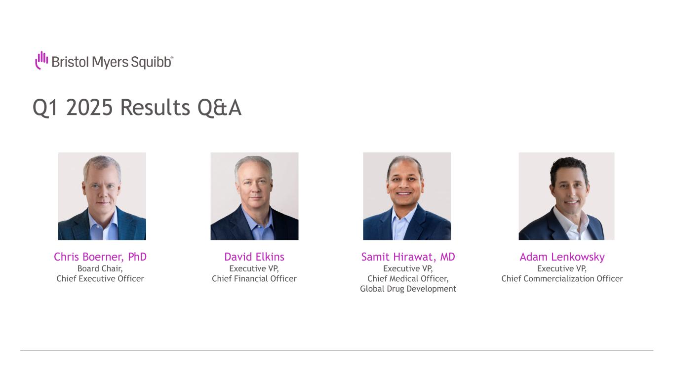 Not for Product Promotional UseQ1 2025 Results Forward Looking Statements and Non-GAAP Financial Information 2 This presentation contains statements about Bristol-Myers Squibb Company’s (the “Company”) future financial results, plans, business development strategy, anticipated clinical trials, results and regulatory approvals that constitute forward-looking statements for purposes of the safe harbor provisions under the Private Securities Litigation Reform Act of 1995. All statements that are not statements of historical facts are, or may be deemed to be, forward-looking statements. Actual results may differ materially from those expressed in, or implied by, these statements as a result of various factors, including, but not limited to: (i) new laws, government actions and regulations, including with respect to pricing controls and market access and the imposition of new tariffs, trade restrictions and export regulations, (ii) our ability to obtain, protect and maintain market exclusivity rights and enforce patents and other intellectual property rights, (iii) our ability to achieve expected clinical, regulatory and contractual milestones on expected timelines or at all, (iv) difficulties or delays in the development and commercialization of new products, (v) difficulties or delays in our clinical trials and the manufacturing, distribution and sale of our products, (vi) adverse outcomes in legal or regulatory proceedings, (vii) risks relating to acquisitions, divestitures, alliances, joint ventures and other portfolio actions and (viii) political and financial instability, including changes in general economic conditions. These and other important factors are discussed in the Company’s most recent annual report on Form 10-K and reports on Forms 10-Q and 8-K. These documents are available on the U.S. Securities and Exchange Commission’s website, on the Company’s website or from Bristol- Myers Squibb Investor Relations. No forward-looking statements can be guaranteed. In addition, any forward-looking statements and clinical data included herein are presented only as of the date hereof. Except as otherwise required by applicable law, the Company undertakes no obligation to publicly update any of the provided information, whether as a result of new information, future events, changed circumstances or otherwise. This presentation includes certain non-generally accepted accounting principles (“GAAP”) financial measures that we use to describe the Company’s performance. The non-GAAP financial measures are provided as supplemental information and are presented because management has evaluated the Company’s financial results both including and excluding the adjusted items or the effects of foreign currency translation, as applicable, and believes that the non-GAAP financial measures presented portray the results of the Company’s baseline performance, supplement or enhance management’s, analysts’ and investors’ overall understanding of the Company’s underlying financial performance and trends and facilitate comparisons among current, past and future periods. This presentation also provides certain revenues and expenses excluding the impact of foreign exchange (“Ex- FX”). We calculate foreign exchange impacts by converting our current-period local currency financial results using the prior period average currency rates and comparing these adjusted amounts to our current-period results. Ex-FX financial measures are not accounted for according to GAAP because they remove the effects of currency movements from GAAP results. The non-GAAP information presented herein provides investors with additional useful information but should not be considered in isolation or as substitutes for the related GAAP measures. Moreover, other companies may define non-GAAP measures differently, which limits the usefulness of these measures for comparisons with such other companies. We encourage investors to review our financial statements and publicly filed reports in their entirety and not to rely on any single financial measure. An explanation of these non-GAAP financial measures and a reconciliation to the most directly comparable financial measure are available on our website at www.bms.com/investors. Also note that a reconciliation of forward-looking non-GAAP measures, including non-GAAP earnings per share (EPS), to the most directly comparable GAAP measures is not provided because comparable GAAP measures for such measures are not reasonably accessible or reliable due to the inherent difficulty in forecasting and quantifying measures that would be necessary for such reconciliation. Namely, we are not, without unreasonable effort, able to reliably predict the impact of accelerated depreciation and impairment charges, legal and other settlements, gains and losses from equity investments and other adjustments. In addition, the Company believes such a reconciliation would imply a degree of precision and certainty that could be confusing to investors. These items are uncertain, depend on various factors and may have a material impact on our future GAAP results. Certain information presented in the accompanying presentation may not add due to the use of rounded numbers.