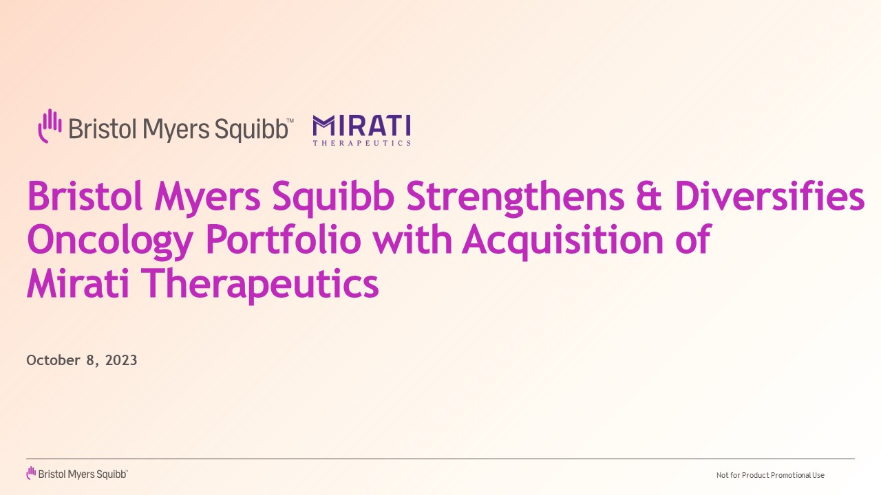 An investor presentation related to the acquisition of Mirati by Bristol Myers Squibb published on October 8, 2023.