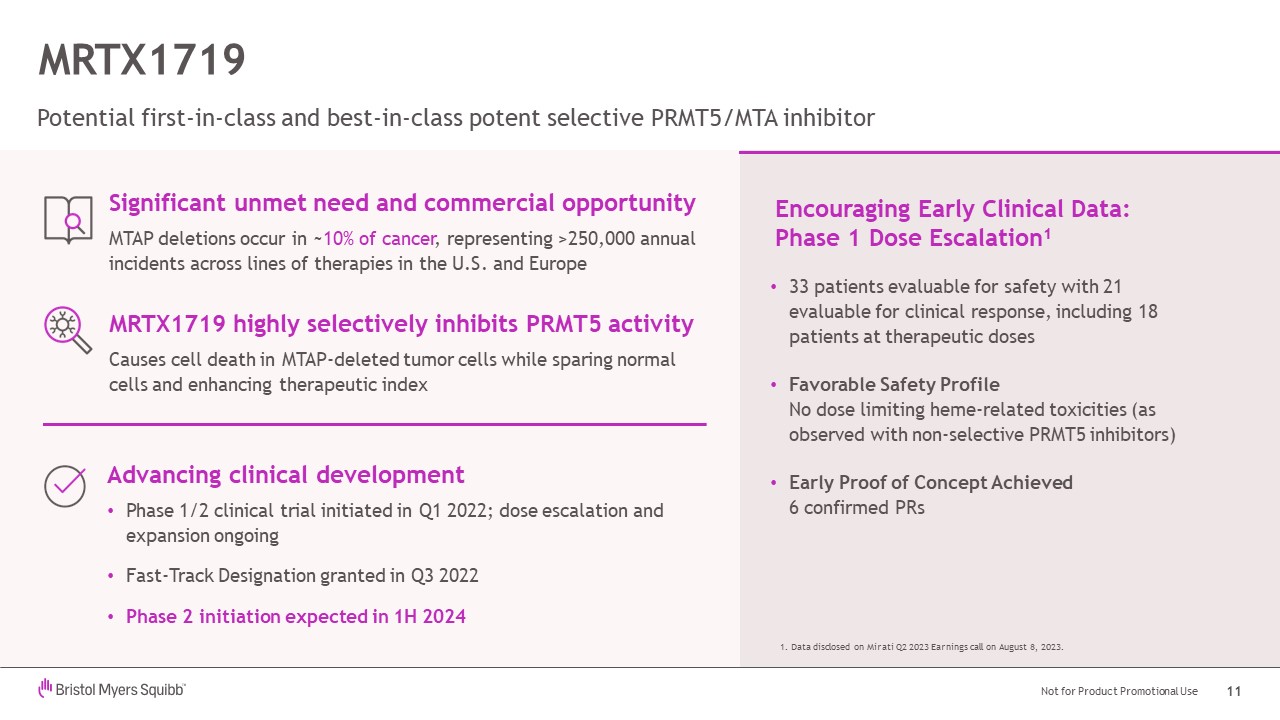 melanoma, with no evidence to date of meaningful hematologic toxicities associated with non-selective PRMT5 inhibitors. MRTX1719 targets MTAP-deleted tumors that comprise approximately 10% of all cancers. Phase 2 clinical trial initiation for