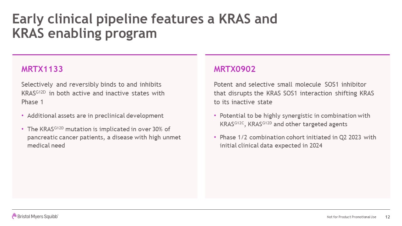 expected in 1H 2024 Early clinical pipeline features KRAS and KRAS enabling program MRTX1133: Selectively and reversibly binds to and inhibits KRASG12D in both active and inactive states with Phase 1 underway. Additional assets are in preclinical