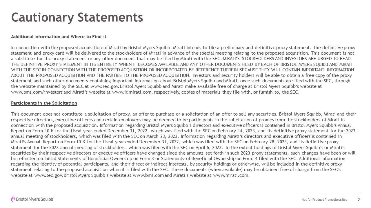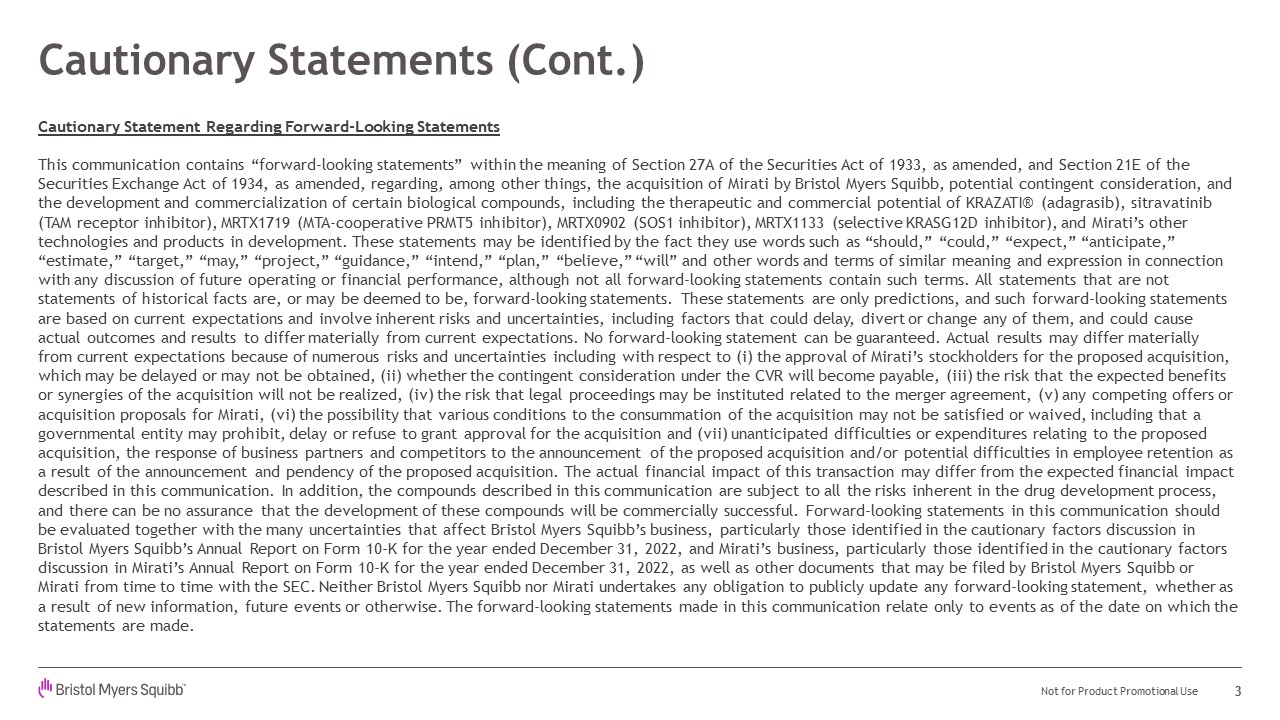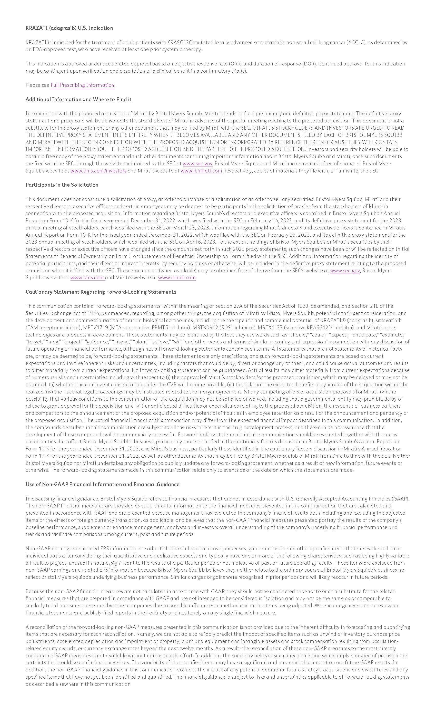 10-K for the year ended December 31, 2022, as well as other documents that may be filed by Bristol Myers Squibb or Mirati from time to time with the SEC. Neither Bristol Myers Squibb nor Mirati undertakes any obligation to publicly update any