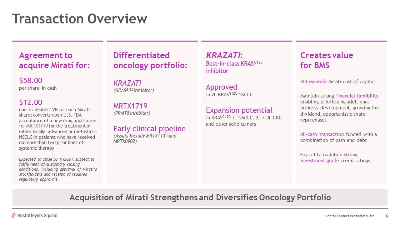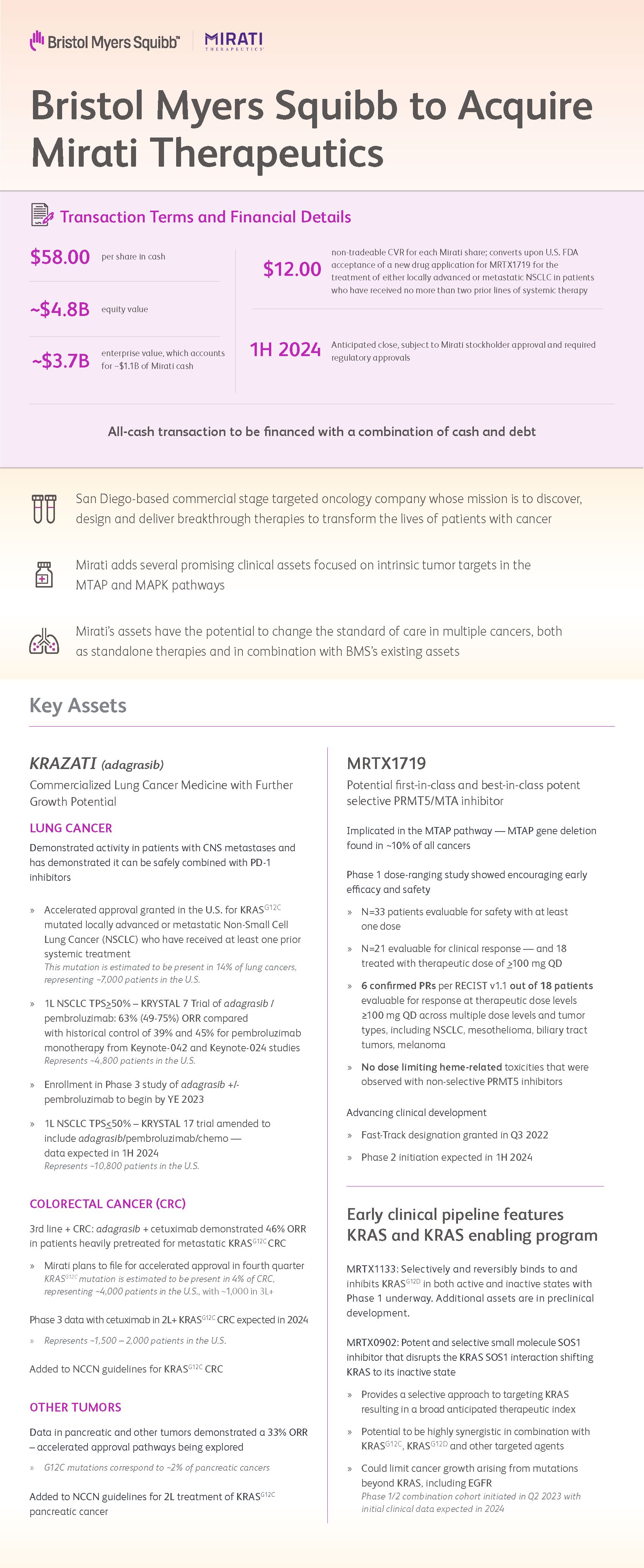 Bristol Myers Squibb to Acquire Mirati Therapeutics Transaction Terms and Financial Details $58.00 non-tradeable CVR for each Mirati share; converts upon U.S. FDA acceptance of a new drug application for MRTX1719 for