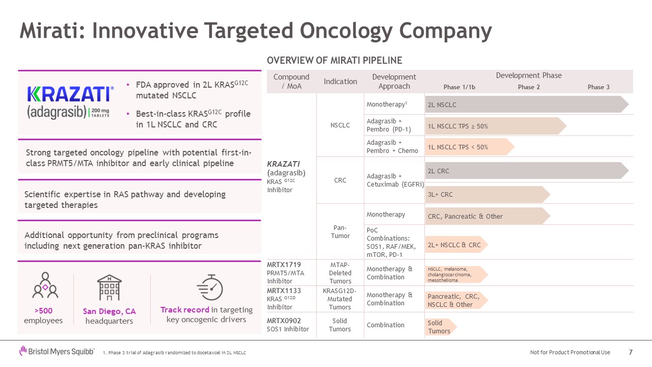 Mirati is a commercial stage targeted oncology company whose mission is to discover, design and deliver breakthrough therapies to transform the lives of patients with cancer and their loved ones. Mirati’s assets are a strong fit with Bristol Myers