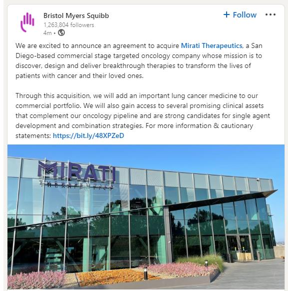 I am writing to share some exciting news about Bristol Myers Squibb. We announced that BMS entered into an agreement to acquire Mirati Therapeutics, a San Diego-based commercial stage targeted oncology company whose mission is to discover, design