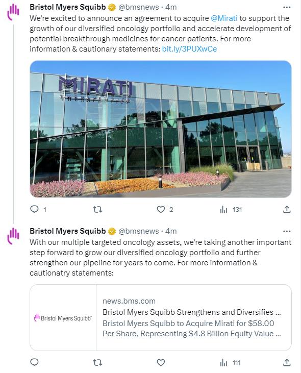 Social Media Posts of Bristol Myers Squibb relating to the acquisition published on October 8, 2023.