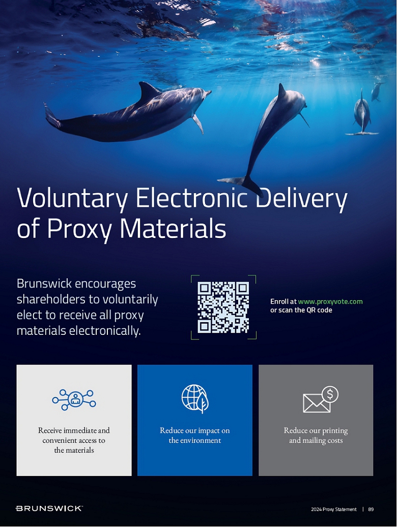| Certain statements in this Proxy Statement are forward-looking statements as defined in the Private Securities Litigation Reform Act of 1995. Forward-looking statements are based on current expectations, estimates, and projections and by their nature address matters that are, to different degrees, uncertain. Words such as “may,” “could,” “should,” “expect,” “believe” and similar expressions are intended to identify forward-looking statements. Forward-looking statements are not guarantees of future performance and involve certain risks that may cause actual results to differ materially from expectations as of the date of this Proxy Statement. These risks include, but are not limited to, those set forth in Brunswick’s Annual Report on Form 10-K for the fiscal year ended December 31, 2023 and subsequent reports filed with the Securities and Exchange Commission. |