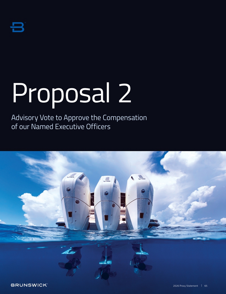 | Signature [PLEASE SIGN WITHIN BOX] Date Signature (Joint Owners) Date TO VOTE, MARK BLOCKS BELOW IN BLUE OR BLACK INK AS FOLLOWS: KEEP THIS PORTION FOR YOUR RECORDS DETACH AND RETURN THIS PORTION ONLY THIS PROXY CARD IS VALID ONLY WHEN SIGNED AND DATED. V86822-P44985 For Against Abstain For Against Abstain ! ! ! ! ! ! ! ! ! ! ! ! ! ! ! ! ! ! ! ! ! ! ! ! ! ! ! ! ! ! ! ! ! ! ! ! BRUNSWICK CORPORATION 26125 N. RIVERWOODS BLVD., SUITE 500 METTAWA, IL 60045-3420 1. The Election to Brunswick’s Board of Directors of the ten nominees named in the Proxy Statement. The Board of Directors recommends you vote FOR all of the following nominees: 1a. Nancy E. Cooper 1b. David C. Everitt 1c. Reginald Fils-Aimé 1d. Lauren P. Flaherty 1e. David M. Foulkes 1f. Joseph W. McClanathan 1g. David V. Singer 1h. J. Steven Whisler 1i. Roger J. Wood 1j. MaryAnn Wright BRUNSWICK CORPORATION The Board of Directors recommends you vote FOR the following proposals: 2. Advisory vote to approve the compensation of our Named Executive Officers. 3. The ratification of the Audit and Finance Committee’s appointment of Deloitte & Touche LLP as the Company’s independent registered public accounting firm for the fiscal year ending December 31, 2026. NOTE: In their discretion, on such other business as may properly come before the meeting. Please sign exactly as your name(s) appear(s) hereon. When signing as attorney, executor, administrator or other fiduciary, please give full title as such. Joint owners should each sign personally. All holders must sign. If a corporation or partnership, please sign in full corporate or partnership name by authorized officer. SCAN TO VIEW MATERIALS & VOTEw VOTE BY INTERNET Before The Meeting - Go to www.proxyvote.com or scan the QR Barcode above Use the Internet to transmit your voting instructions and for electronic delivery of information until 11:59 P.M. Eastern Time on Tuesday, May 5, 2026 for shares held directly and until 11:59 P.M. Eastern Time on May 1, 2026 for the Trustee to vote the employee plan shares. Have your proxy card in hand when you access the website and follow the instructions to obtain your records and to create an electronic voting instruction form. During The Meeting - Go to www.virtualshareholdermeeting.com/BC2026 You may attend the meeting via the Internet and vote during the meeting. Have the information that is printed in the box marked by the arrow available and follow the instructions. VOTE BY PHONE - 1-800-690-6903 Use any touch-tone telephone to transmit your voting instructions until 11:59 P.M. Eastern Time on Tuesday, May 5, 2026 for shares held directly and until 11:59 P.M. Eastern Time on May 1, 2026 for the Trustee to vote the employee plan shares. Have your proxy card in hand when you call and follow the instructions. VOTE BY MAIL Mark, sign, and date your proxy card and return it in the postage-paid envelope we have provided or return it to Vote Processing, c/o Broadridge, 51 Mercedes Way, Edgewood, NY 11717 to arrive by May 5, 2026. ELECTRONIC DELIVERY OF FUTURE PROXY MATERIALS You can consent to receive all future proxy statements, proxy cards, and annual reports electronically via e-mail or the Internet. To sign up for electronic delivery, please follow the instructions above to vote using the Internet and indicate that you agree to receive or access proxy materials electronically in future years. |