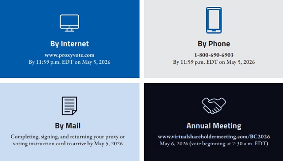 We invite you to join us for our annual meeting of shareholders, which will be conducted via live audio webcast on May 6, 2026. You may attend the virtual meeting of shareholders online and submit your questions during the meeting by visiting www.virtualshareholdermeeting.com/BC2026. We look forward to your attendance and participation again this year.