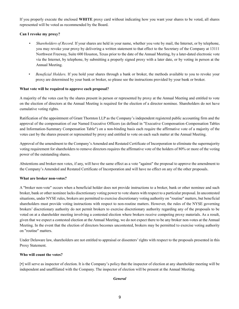 If you properly execute the enclosed WHITE proxy card without indicating how you want your shares to be voted, all shares represented will be voted as recommended by the Board. Can I revoke my proxy? • Shareholders of Record. If your shares are held in your name, whether you vote by mail, the Internet, or by telephone, you may revoke your proxy by delivering a written statement to that effect to the Secretary of the Company at 13111 Northwest Freeway, Suite 600 Houston, Texas prior to the date of the Annual Meeting, by a later-dated electronic vote via the Internet, by telephone, by submitting a properly signed proxy with a later date, or by voting in person at the Annual Meeting. • Beneficial Holders. If you hold your shares through a bank or broker, the methods available to you to revoke your proxy are determined by your bank or broker, so please see the instructions provided by your bank or broker. What vote will be required to approve each proposal? A majority of the votes cast by the shares present in person or represented by proxy at the Annual Meeting and entitled to vote on the election of directors at the Annual Meeting is required for the election of a director nominee. Shareholders do not have cumulative voting rights. Ratification of the appointment of Grant Thornton LLP as the Company’s independent registered public accounting firm and the approval of the compensation of our Named Executive Officers (as defined in "Executive Compensation-Compensation Tables and Information-Summary Compensation Table") on a non-binding basis each require the affirmative vote of a majority of the votes cast by the shares present or represented by proxy and entitled to vote on each such matter at the Annual Meeting. Approval of the amendment to the Company’s Amended and Restated Certificate of Incorporation to eliminate the supermajority voting requirement for shareholders to remove directors requires the affirmative vote of the holders of 80% or more of the voting power of the outstanding shares. Abstentions and broker-non votes, if any, will have the same effect as a vote "against" the proposal to approve the amendment to the Company’s Amended and Restated Certificate of Incorporation and will have no effect on any of the other proposals. What are broker non-votes? A "broker non-vote" occurs when a beneficial holder does not provide instructions to a broker, bank or other nominee and such broker, bank or other nominee lacks discretionary voting power to vote shares with respect to a particular proposal. In uncontested situations, under NYSE rules, brokers are permitted to exercise discretionary voting authority on "routine" matters, but beneficial shareholders must provide voting instructions with respect to non-routine matters. However, the rules of the NYSE governing brokers’ discretionary authority do not permit brokers to exercise discretionary authority regarding any of the proposals to be voted on at a shareholder meeting involving a contested election where brokers receive competing proxy materials. As a result, given that we expect a contested election at the Annual Meeting, we do not expect there to be any broker non-votes at the Annual Meeting. In the event that the election of directors becomes uncontested, brokers may be permitted to exercise voting authority on "routine" matters. Under Delaware law, shareholders are not entitled to appraisal or dissenters’ rights with respect to the proposals presented in this Proxy Statement. Who will count the votes? [•] will serve as inspector of election. It is the Company’s policy that the inspector of election at any shareholder meeting will be independent and unaffiliated with the Company. The inspector of election will be present at the Annual Meeting. General 9