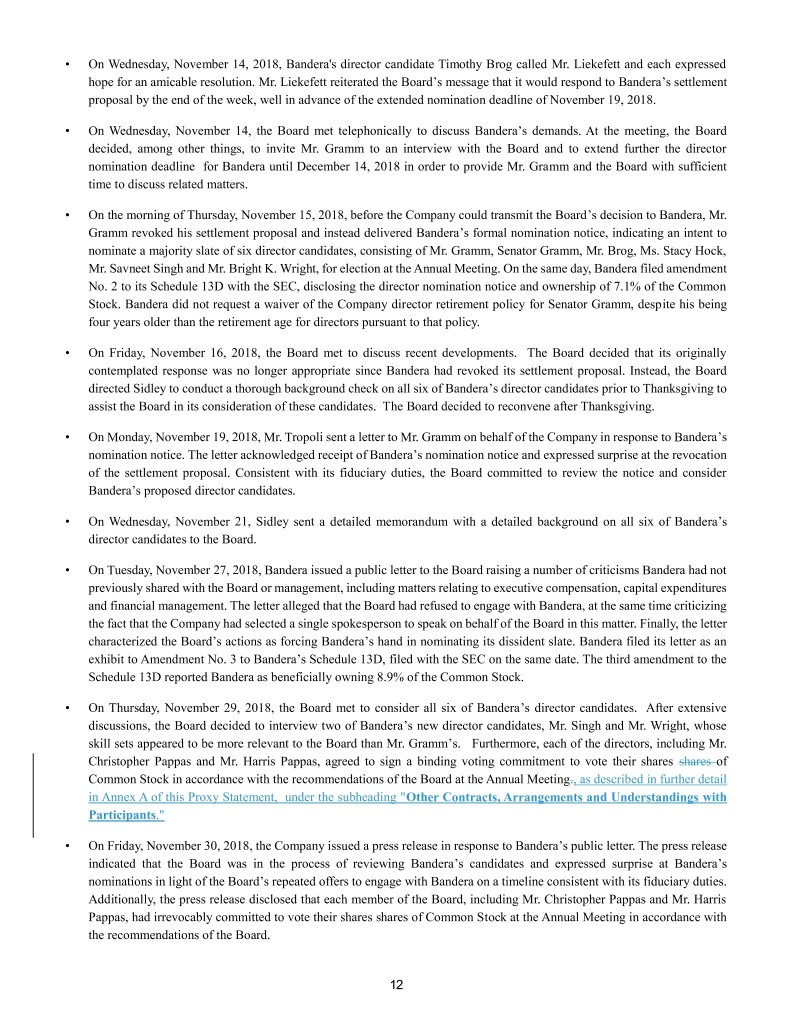 • On Wednesday, November 14, 2018, Bandera's director candidate Timothy Brog called Mr. Liekefett and each expressed hope for an amicable resolution. Mr. Liekefett reiterated the Board’s message that it would respond to Bandera’s settlement proposal by the end of the week, well in advance of the extended nomination deadline of November 19, 2018. • On Wednesday, November 14, the Board met telephonically to discuss Bandera’s demands. At the meeting, the Board decided, among other things, to invite Mr. Gramm to an interview with the Board and to extend further the director nomination deadline for Bandera until December 14, 2018 in order to provide Mr. Gramm and the Board with sufficient time to discuss related matters. • On the morning of Thursday, November 15, 2018, before the Company could transmit the Board’s decision to Bandera, Mr. Gramm revoked his settlement proposal and instead delivered Bandera’s formal nomination notice, indicating an intent to nominate a majority slate of six director candidates, consisting of Mr. Gramm, Senator Gramm, Mr. Brog, Ms. Stacy Hock, Mr. Savneet Singh and Mr. Bright K. Wright, for election at the Annual Meeting. On the same day, Bandera filed amendment No. 2 to its Schedule 13D with the SEC, disclosing the director nomination notice and ownership of 7.1% of the Common Stock. Bandera did not request a waiver of the Company director retirement policy for Senator Gramm, despite his being four years older than the retirement age for directors pursuant to that policy. • On Friday, November 16, 2018, the Board met to discuss recent developments. The Board decided that its originally contemplated response was no longer appropriate since Bandera had revoked its settlement proposal. Instead, the Board directed Sidley to conduct a thorough background check on all six of Bandera’s director candidates prior to Thanksgiving to assist the Board in its consideration of these candidates. The Board decided to reconvene after Thanksgiving. • On Monday, November 19, 2018, Mr. Tropoli sent a letter to Mr. Gramm on behalf of the Company in response to Bandera’s nomination notice. The letter acknowledged receipt of Bandera’s nomination notice and expressed surprise at the revocation of the settlement proposal. Consistent with its fiduciary duties, the Board committed to review the notice and consider Bandera’s proposed director candidates. • On Wednesday, November 21, Sidley sent a detailed memorandum with a detailed background on all six of Bandera’s director candidates to the Board. • On Tuesday, November 27, 2018, Bandera issued a public letter to the Board raising a number of criticisms Bandera had not previously shared with the Board or management, including matters relating to executive compensation, capital expenditures and financial management. The letter alleged that the Board had refused to engage with Bandera, at the same time criticizing the fact that the Company had selected a single spokesperson to speak on behalf of the Board in this matter. Finally, the letter characterized the Board’s actions as forcing Bandera’s hand in nominating its dissident slate. Bandera filed its letter as an exhibit to Amendment No. 3 to Bandera’s Schedule 13D, filed with the SEC on the same date. The third amendment to the Schedule 13D reported Bandera as beneficially owning 8.9% of the Common Stock. • On Thursday, November 29, 2018, the Board met to consider all six of Bandera’s director candidates. After extensive discussions, the Board decided to interview two of Bandera’s new director candidates, Mr. Singh and Mr. Wright, whose skill sets appeared to be more relevant to the Board than Mr. Gramm’s. Furthermore, each of the directors, including Mr. Christopher Pappas and Mr. Harris Pappas, agreed to sign a binding voting commitment to vote their shares shares of Common Stock in accordance with the recommendations of the Board at the Annual Meeting., as described in further detail in Annex A of this Proxy Statement, under the subheading "Other Contracts, Arrangements and Understandings with Participants." • On Friday, November 30, 2018, the Company issued a press release in response to Bandera’s public letter. The press release indicated that the Board was in the process of reviewing Bandera’s candidates and expressed surprise at Bandera’s nominations in light of the Board’s repeated offers to engage with Bandera on a timeline consistent with its fiduciary duties. Additionally, the press release disclosed that each member of the Board, including Mr. Christopher Pappas and Mr. Harris Pappas, had irrevocably committed to vote their shares shares of Common Stock at the Annual Meeting in accordance with the recommendations of the Board. 12