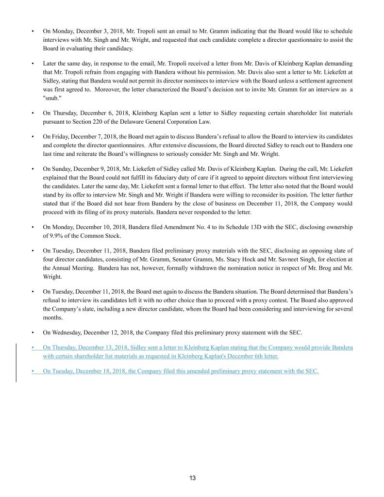 • On Monday, December 3, 2018, Mr. Tropoli sent an email to Mr. Gramm indicating that the Board would like to schedule interviews with Mr. Singh and Mr. Wright, and requested that each candidate complete a director questionnaire to assist the Board in evaluating their candidacy. • Later the same day, in response to the email, Mr. Tropoli received a letter from Mr. Davis of Kleinberg Kaplan demanding that Mr. Tropoli refrain from engaging with Bandera without his permission. Mr. Davis also sent a letter to Mr. Liekefett at Sidley, stating that Bandera would not permit its director nominees to interview with the Board unless a settlement agreement was first agreed to. Moreover, the letter characterized the Board’s decision not to invite Mr. Gramm for an interview as a "snub." • On Thursday, December 6, 2018, Kleinberg Kaplan sent a letter to Sidley requesting certain shareholder list materials pursuant to Section 220 of the Delaware General Corporation Law. • On Friday, December 7, 2018, the Board met again to discuss Bandera’s refusal to allow the Board to interview its candidates and complete the director questionnaires. After extensive discussions, the Board directed Sidley to reach out to Bandera one last time and reiterate the Board’s willingness to seriously consider Mr. Singh and Mr. Wright. • On Sunday, December 9, 2018, Mr. Liekefett of Sidley called Mr. Davis of Kleinberg Kaplan. During the call, Mr. Liekefett explained that the Board could not fulfill its fiduciary duty of care if it agreed to appoint directors without first interviewing the candidates. Later the same day, Mr. Liekefett sent a formal letter to that effect. The letter also noted that the Board would stand by its offer to interview Mr. Singh and Mr. Wright if Bandera were willing to reconsider its position. The letter further stated that if the Board did not hear from Bandera by the close of business on December 11, 2018, the Company would proceed with its filing of its proxy materials. Bandera never responded to the letter. • On Monday, December 10, 2018, Bandera filed Amendment No. 4 to its Schedule 13D with the SEC, disclosing ownership of 9.9% of the Common Stock. • On Tuesday, December 11, 2018, Bandera filed preliminary proxy materials with the SEC, disclosing an opposing slate of four director candidates, consisting of Mr. Gramm, Senator Gramm, Ms. Stacy Hock and Mr. Savneet Singh, for election at the Annual Meeting. Bandera has not, however, formally withdrawn the nomination notice in respect of Mr. Brog and Mr. Wright. • On Tuesday, December 11, 2018, the Board met again to discuss the Bandera situation. The Board determined that Bandera’s refusal to interview its candidates left it with no other choice than to proceed with a proxy contest. The Board also approved the Company’s slate, including a new director candidate, whom the Board had been considering and interviewing for several months. • On Wednesday, December 12, 2018, the Company filed this preliminary proxy statement with the SEC. • On Thursday, December 13, 2018, Sidley sent a letter to Kleinberg Kaplan stating that the Company would provide Bandera with certain shareholder list materials as requested in Kleinberg Kaplan's December 6th letter. • On Tuesday, December 18, 2018, the Company filed this amended preliminary proxy statement with the SEC. 13