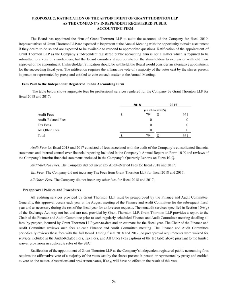 PROPOSAL 2: RATIFICATION OF THE APPOINTMENT OF GRANT THORNTON LLP AS THE COMPANY’S INDEPENDENT REGISTERED PUBLIC ACCOUNTING FIRM The Board has appointed the firm of Grant Thornton LLP to audit the accounts of the Company for fiscal 2019. Representatives of Grant Thornton LLP are expected to be present at the Annual Meeting with the opportunity to make a statement if they desire to do so and are expected to be available to respond to appropriate questions. Ratification of the appointment of Grant Thornton LLP as the Company’s independent registered public accounting firm is not a matter which is required to be submitted to a vote of shareholders, but the Board considers it appropriate for the shareholders to express or withhold their approval of the appointment. If shareholder ratification should be withheld, the Board would consider an alternative appointment for the succeeding fiscal year. The ratification requires the affirmative vote of a majority of the votes cast by the shares present in person or represented by proxy and entitled to vote on such matter at the Annual Meeting. Fees Paid to the Independent Registered Public Accounting Firm The table below shows aggregate fees for professional services rendered for the Company by Grant Thornton LLP for fiscal 2018 and 2017: 2018 2017 (in thousands) Audit Fees $ 794 $ 661 Audit-Related Fees 0 0 Tax Fees 0 0 All Other Fees 0 0 Total $ 794 $ 661 Audit Fees for fiscal 2018 and 2017 consisted of fees associated with the audit of the Company’s consolidated financial statements and internal control over financial reporting included in the Company’s Annual Report on Form 10-K and reviews of the Company’s interim financial statements included in the Company’s Quarterly Reports on Form 10-Q. Audit-Related Fees. The Company did not incur any Audit-Related Fees for fiscal 2018 and 2017. Tax Fees. The Company did not incur any Tax Fees from Grant Thornton LLP for fiscal 2018 and 2017. All Other Fees. The Company did not incur any other fees for fiscal 2018 and 2017. Preapproval Policies and Procedures All auditing services provided by Grant Thornton LLP must be preapproved by the Finance and Audit Committee. Generally, this approval occurs each year at the August meeting of the Finance and Audit Committee for the subsequent fiscal year and as necessary during the rest of the fiscal year for unforeseen requests. The nonaudit services specified in Section 10A(g) of the Exchange Act may not be, and are not, provided by Grant Thornton LLP. Grant Thornton LLP provides a report to the Chair of the Finance and Audit Committee prior to each regularly scheduled Finance and Audit Committee meeting detailing all fees, by project, incurred by Grant Thornton LLP year-to-date and an estimate for the fiscal year. The Chair of the Finance and Audit Committee reviews such fees at each Finance and Audit Committee meeting. The Finance and Audit Committee periodically reviews these fees with the full Board. During fiscal 2018 and 2017, no preapproval requirements were waived for services included in the Audit-Related Fees, Tax Fees, and All Other Fees captions of the fee table above pursuant to the limited waiver provisions in applicable rules of the SEC. Ratification of the appointment of Grant Thornton LLP as the Company’s independent registered public accounting firm requires the affirmative vote of a majority of the votes cast by the shares present in person or represented by proxy and entitled to vote on the matter. Abstentions and broker non-votes, if any, will have no effect on the result of this vote. 24