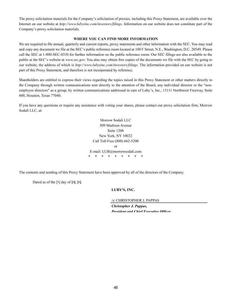 The proxy solicitation materials for the Company’s solicitation of proxies, including this Proxy Statement, are available over the Internet on our website at http://www.lubysinc.com/investors/filings. Information on our website does not constitute part of the Company’s proxy solicitation materials. WHERE YOU CAN FIND MORE INFORMATION We are required to file annual, quarterly and current reports, proxy statements and other information with the SEC. You may read and copy any document we file at the SEC’s public reference room located at 100 F Street, N.E., Washington, D.C. 20549. Please call the SEC at 1-800-SEC-0330 for further information on the public reference room. Our SEC filings are also available to the public at the SEC’s website at www.sec.gov. You also may obtain free copies of the documents we file with the SEC by going to our website, the address of which is http://www.lubysinc.com/investors/filings. The information provided on our website is not part of this Proxy Statement, and therefore is not incorporated by reference. Shareholders are entitled to express their views regarding the topics raised in this Proxy Statement or other matters directly to the Company through written communications sent directly to the attention of the Board, any individual director or the "non- employee directors" as a group, by written communications addressed in care of Luby’s, Inc., 13111 Northwest Freeway, Suite 600, Houston, Texas 77040. If you have any questions or require any assistance with voting your shares, please contact our proxy solicitation firm, Morrow Sodali LLC, at: Morrow Sodali LLC 509 Madison Avenue Suite 1206 New York, NY 10022 Call Toll-Free (800) 662-5200 or E-mail: LUB@morrowsodali.com * * * * * * * * * The contents and sending of this Proxy Statement have been approved by all of the directors of the Company. Dated as of the [•] day of [•], [•]. LUBY'S, INC. /s/ CHRISTOPHER J. PAPPAS Christopher J. Pappas, President and Chief Executive Officer 48