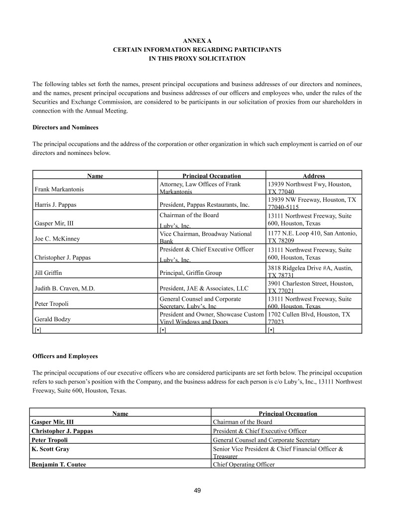ANNEX A CERTAIN INFORMATION REGARDING PARTICIPANTS IN THIS PROXY SOLICITATION The following tables set forth the names, present principal occupations and business addresses of our directors and nominees, and the names, present principal occupations and business addresses of our officers and employees who, under the rules of the Securities and Exchange Commission, are considered to be participants in our solicitation of proxies from our shareholders in connection with the Annual Meeting. Directors and Nominees The principal occupations and the address of the corporation or other organization in which such employment is carried on of our directors and nominees below. Name Principal Occupation Address Attorney, Law Offices of Frank 13939 Northwest Fwy, Houston, Frank Markantonis Markantonis TX 77040 13939 NW Freeway, Houston, TX Harris J. Pappas President, Pappas Restaurants, Inc. 77040-5115 Chairman of the Board 13111 Northwest Freeway, Suite Gasper Mir, III Luby’s, Inc. 600, Houston, Texas Vice Chairman, Broadway National 1177 N.E. Loop 410, San Antonio, Joe C. McKinney Bank TX 78209 President & Chief Executive Officer 13111 Northwest Freeway, Suite Christopher J. Pappas Luby’s, Inc. 600, Houston, Texas 3818 Ridgelea Drive #A, Austin, Jill Griffin Principal, Griffin Group TX 78731 3901 Charleston Street, Houston, Judith B. Craven, M.D. President, JAE & Associates, LLC TX 77021 General Counsel and Corporate 13111 Northwest Freeway, Suite Peter Tropoli Secretary, Luby’s, Inc 600, Houston, Texas President and Owner, Showcase Custom 1702 Cullen Blvd, Houston, TX Gerald Bodzy Vinyl Windows and Doors 77023 [•] [•] [•] Officers and Employees The principal occupations of our executive officers who are considered participants are set forth below. The principal occupation refers to such person’s position with the Company, and the business address for each person is c/o Luby’s, Inc., 13111 Northwest Freeway, Suite 600, Houston, Texas. Name Principal Occupation Gasper Mir, III Chairman of the Board Christopher J. Pappas President & Chief Executive Officer Peter Tropoli General Counsel and Corporate Secretary K. Scott Gray Senior Vice President & Chief Financial Officer & Treasurer Benjamin T. Coutee Chief Operating Officer 49