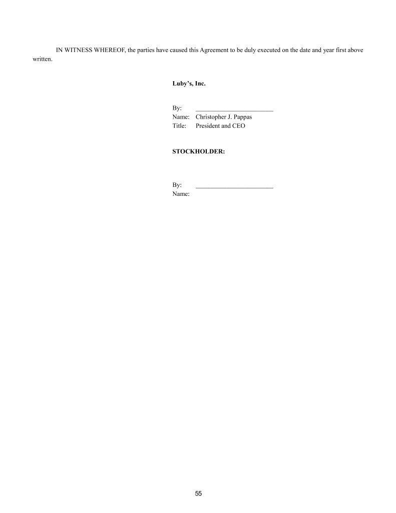 IN WITNESS WHEREOF, the parties have caused this Agreement to be duly executed on the date and year first above written. Luby’s, Inc. By: ________________________ Name: Christopher J. Pappas Title: President and CEO STOCKHOLDER: By: ________________________ Name: 55