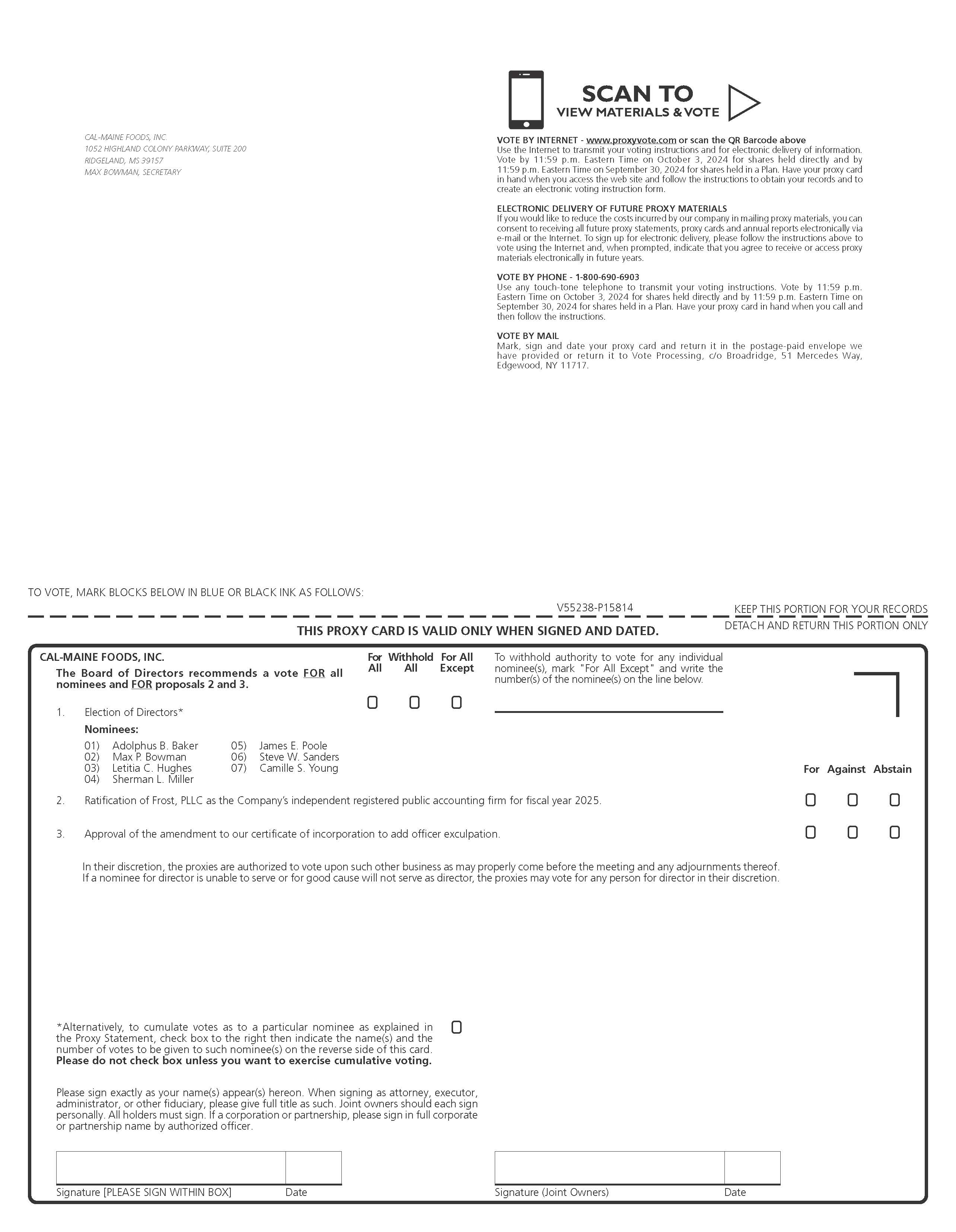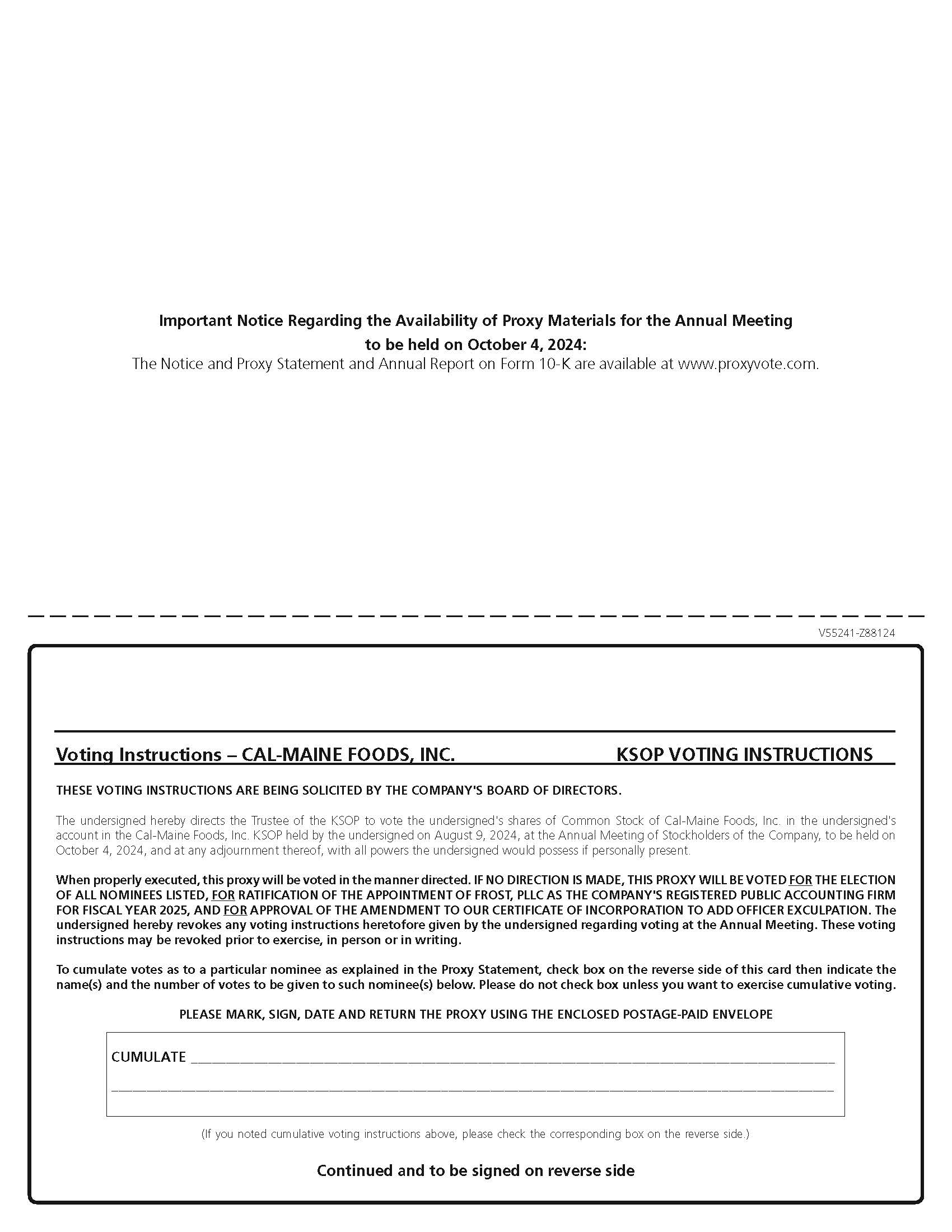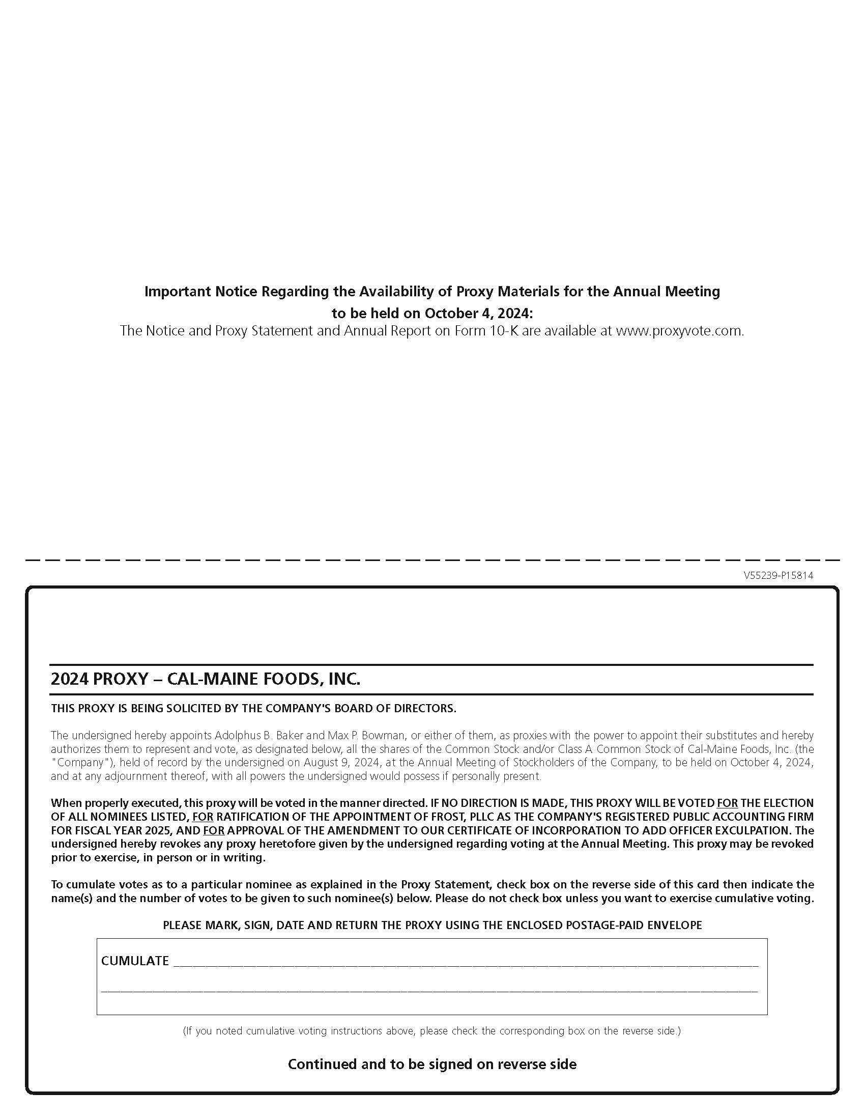 The following proxy materials are being made available to holders of record on August 9, 2024, on or about August 22, 2024, free of charge at our website, www.calmainefoods.com/annual-meeting-and-proxy-material or www.proxyvote.com: