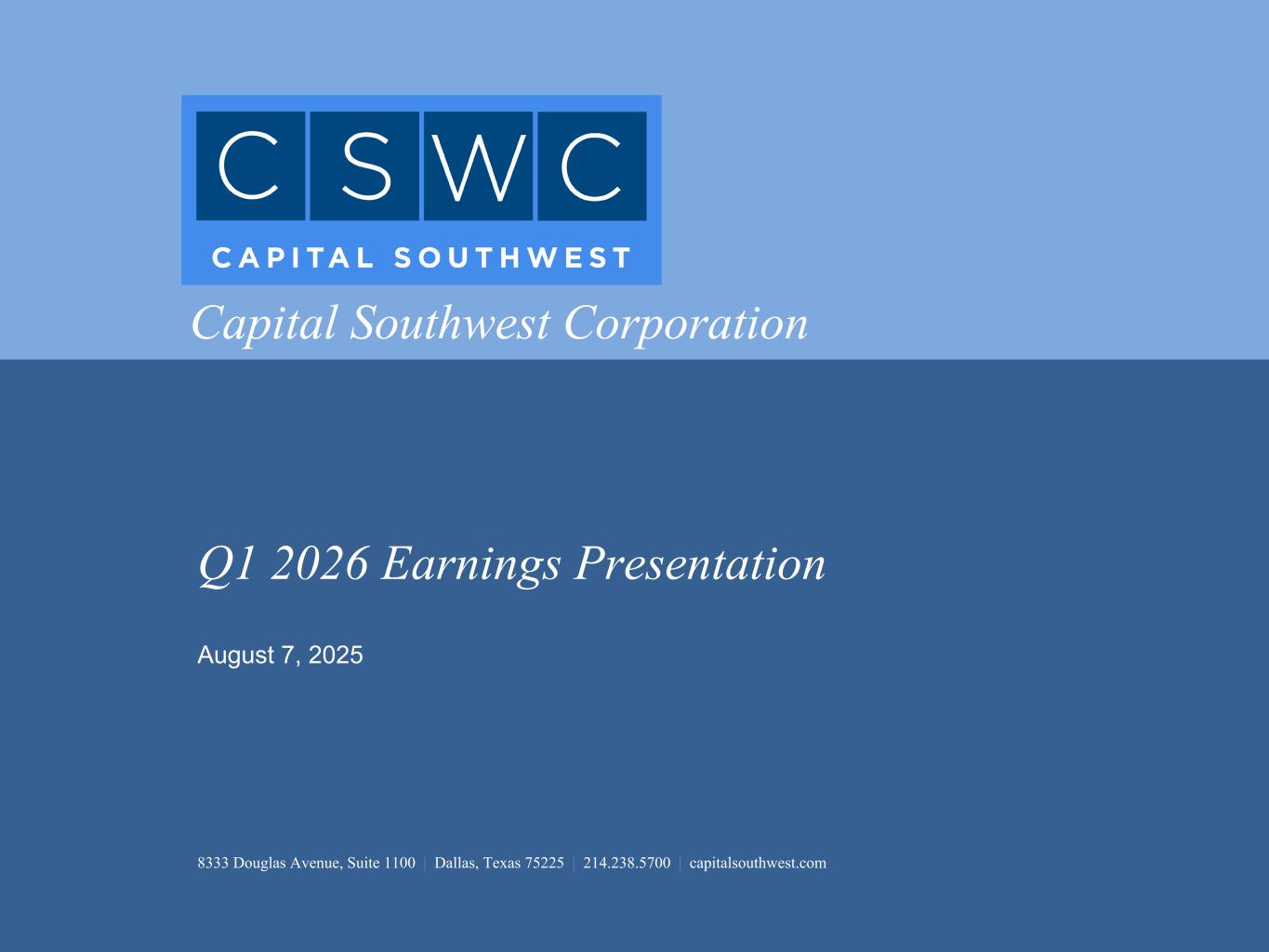 Q1 2026 Earnings Presentation 8333 Douglas Avenue, Suite 1100 | Dallas, Texas 75225 | 214.238.5700 | capitalsouthwest.com August 7, 2025 Capital Southwest Corporation