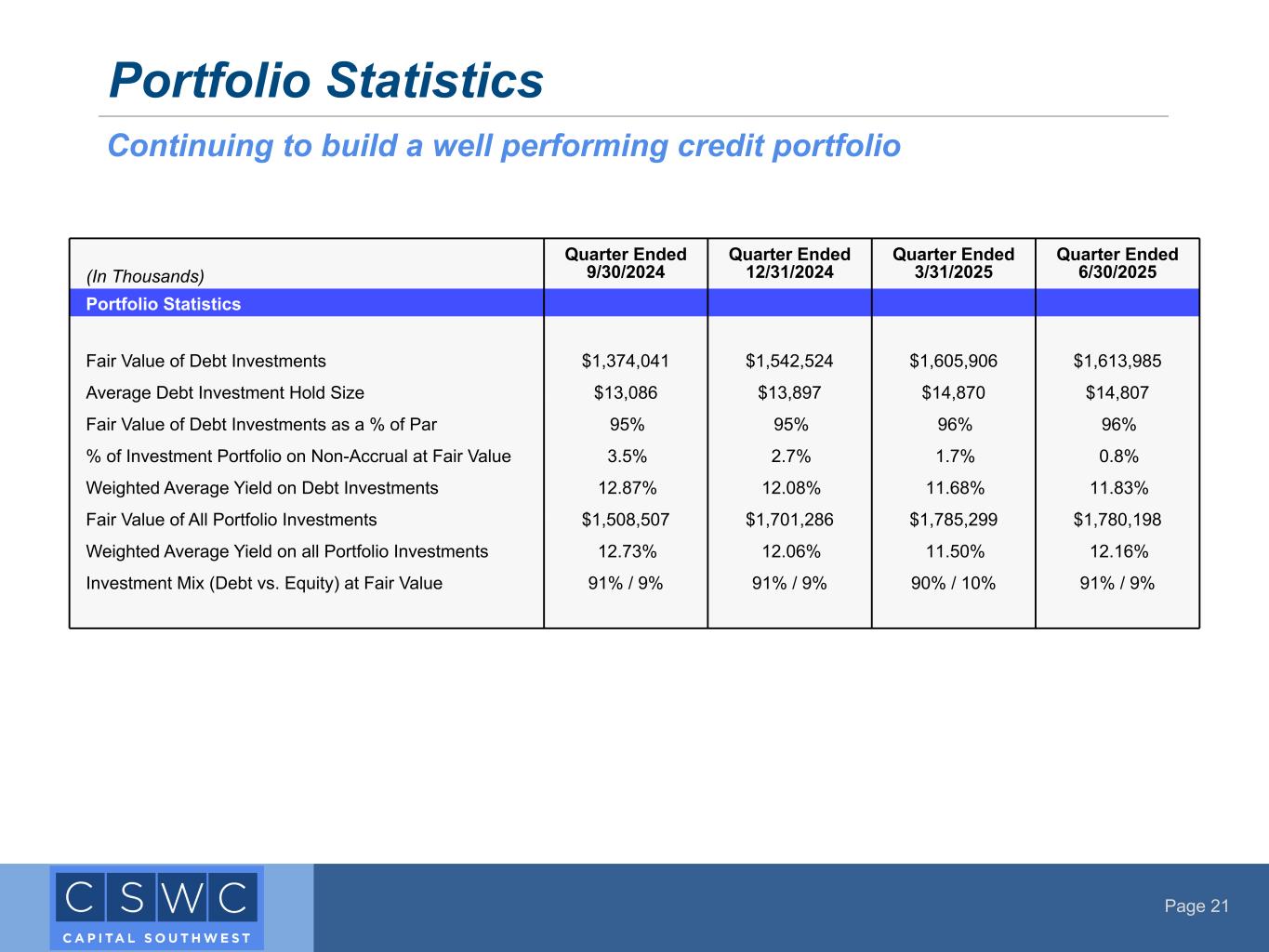 Page 20 Income Statement (In Thousands, except per share amounts) Quarter Ended 9/30/2024 Quarter Ended 12/31/2024 Quarter Ended 3/31/2025 Quarter Ended 6/30/2025 Investment Income Interest Income $43,698 $42,889 $44,619 $47,115 PIK Interest Income 2,398 3,246 3,982 3,260 Dividend Income 572 586 970 3,677 Fees and Other Income 2,038 5,252 2,835 1,895 Total Investment Income $48,706 $51,973 $52,406 $55,947 Expenses Cash Compensation $1,990 $2,388 $3,299 $3,956 Share Based Compensation 1,538 1,544 2,657 1,143 General & Administrative 2,577 2,641 2,778 2,867 Total Expenses (excluding Interest) $6,105 $6,573 $8,734 $7,966 Interest Expense $12,587 $14,717 $15,208 $15,264 Pre-Tax Net Investment Income $30,014 $30,683 $28,464 $32,717 Income Tax (Expense) / Benefit 1,151 (367) (622) (828) Net Investment Income $31,165 $30,316 $27,842 $31,889 Net Realized and Unrealized Losses $(8,481) $(14,048) $(10,281) $(4,888) Net increase in Net Assets Resulting from Operations $22,684 $16,268 $17,561 $27,001 Weighted Average Basic Shares Outstanding 47,243 48,315 50,654 53,517 Pre-Tax NII Per Basic Weighted Average Share $0.64 $0.64 $0.56 $0.61 NII per Basic Weighted Average Share $0.66 $0.63 $0.54 $0.59 Net Increase in Net Assets Per Basic Wtd. Average Share $0.48 $0.34 $0.34 $0.50 Note: For the quarter ended 3/31/2025, Total Expenses include one-time net expenses of $2.8 million, or $0.05 per share, related to the departure of the former President and Chief Executive Officer