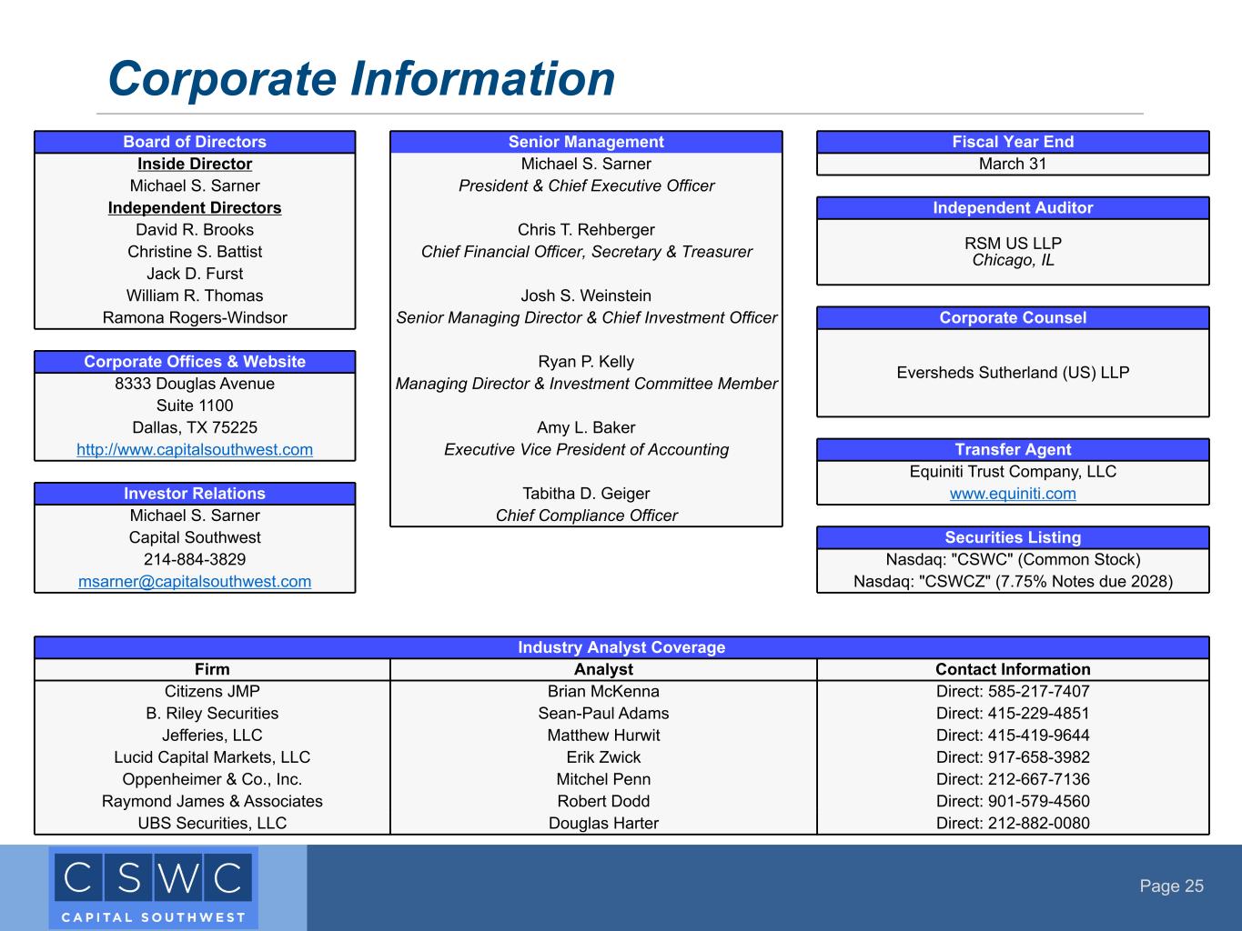 Page 25 Corporate Information Board of Directors Senior Management Fiscal Year End Inside Director Michael S. Sarner March 31 Michael S. Sarner President & Chief Executive Officer Independent Directors Independent Auditor David R. Brooks Chris T. Rehberger RSM US LLP Chicago, ILChristine S. Battist Chief Financial Officer, Secretary & Treasurer Jack D. Furst William R. Thomas Josh S. Weinstein Ramona Rogers-Windsor Senior Managing Director & Chief Investment Officer Corporate Counsel Eversheds Sutherland (US) LLP Corporate Offices & Website Ryan P. Kelly 8333 Douglas Avenue Managing Director & Investment Committee Member Suite 1100 Dallas, TX 75225 Amy L. Baker http://www.capitalsouthwest.com Executive Vice President of Accounting Transfer Agent Equiniti Trust Company, LLC Investor Relations Tabitha D. Geiger www.equiniti.com Michael S. Sarner Chief Compliance Officer Capital Southwest Securities Listing 214-884-3829 Nasdaq: "CSWC" (Common Stock) msarner@capitalsouthwest.com Nasdaq: "CSWCZ" (7.75% Notes due 2028) Industry Analyst Coverage Firm Analyst Contact Information Citizens JMP Brian McKenna Direct: 585-217-7407 B. Riley Securities Sean-Paul Adams Direct: 415-229-4851 Jefferies, LLC Matthew Hurwit Direct: 415-419-9644 Lucid Capital Markets, LLC Erik Zwick Direct: 917-658-3982 Oppenheimer & Co., Inc. Mitchel Penn Direct: 212-667-7136 Raymond James & Associates Robert Dodd Direct: 901-579-4560 UBS Securities, LLC Douglas Harter Direct: 212-882-0080