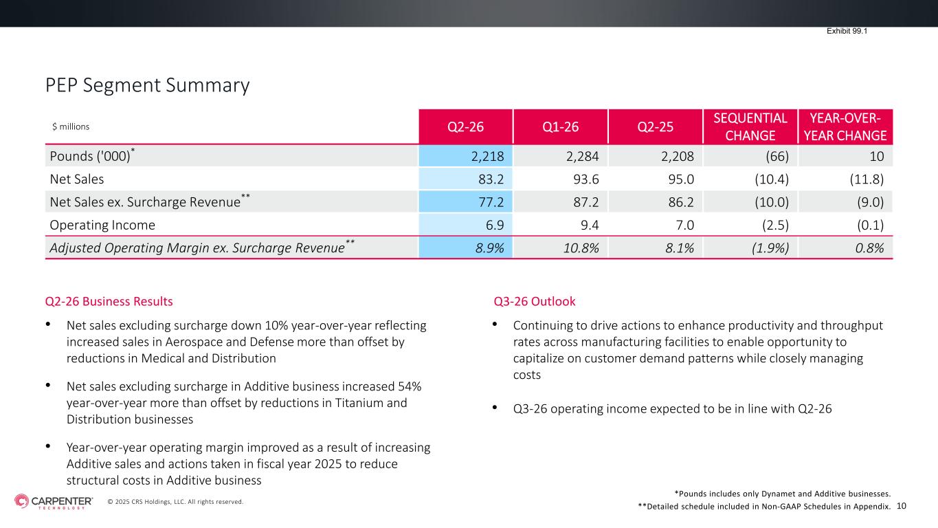 © 2025 CRS Holdings, LLC. All rights reserved. 9 SAO Segment Summary • Net sales excluding surcharge increased 10% year-over-year driven by Aerospace and Defense and Energy end-use markets • Record operating income, up 29% year-over-year, the result of higher productivity, effective mix management and realized benefits of pricing actions • Record adjusted operating margin, the sixteenth consecutive quarter with margin expansion • Maintaining focus on increasing productivity while managing operating costs closely and optimizing product mix • Anticipating increased shipment volumes driven by strong demand, productivity efforts and more available effective capacity uptime compared to Q2-26 • Q3-26 operating income expected to be in the range of $195 million to $200 million $ millions Q2-26 Q1-26 Q2-25 SEQUENTIAL CHANGE YEAR-OVER- YEAR CHANGE Pounds ('000) 46,836 44,750 44,714 2,086 2,122 Net Sales 661.6 659.6 601.5 2.0 60.1 Net Sales ex. Surcharge Revenue* 527.3 533.9 479.6 (6.6) 47.7 Operating Income 174.6 170.7 135.6 3.9 39.0 Adjusted Operating Margin ex. Surcharge Revenue* 33.1% 32.0% 28.3% 1.1% 4.8% Q2-26 Business Results Q3-26 Outlook *Detailed schedule included in Non-GAAP Schedules in Appendix.
