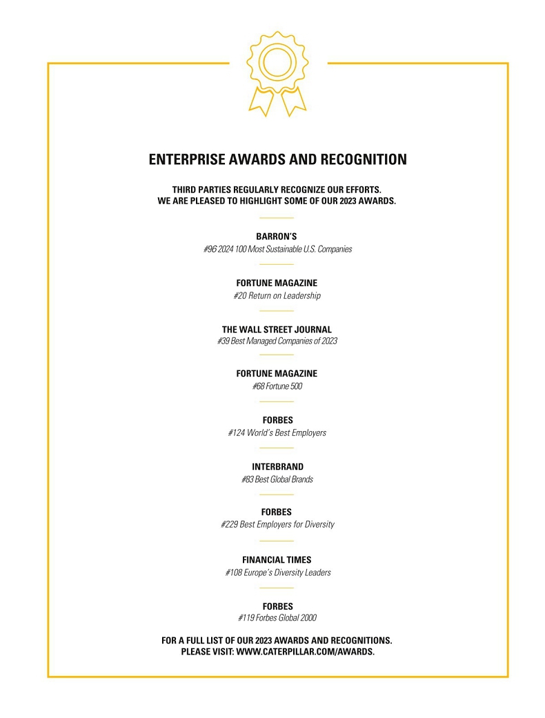 Caterpillar is helping customers build a better, more sustainable world. To learn more, visit www.caterpillar.com/reports to read our latest Annual Report, Sustainability Report, Diversity & Inclusion Report and Lobbying Report.