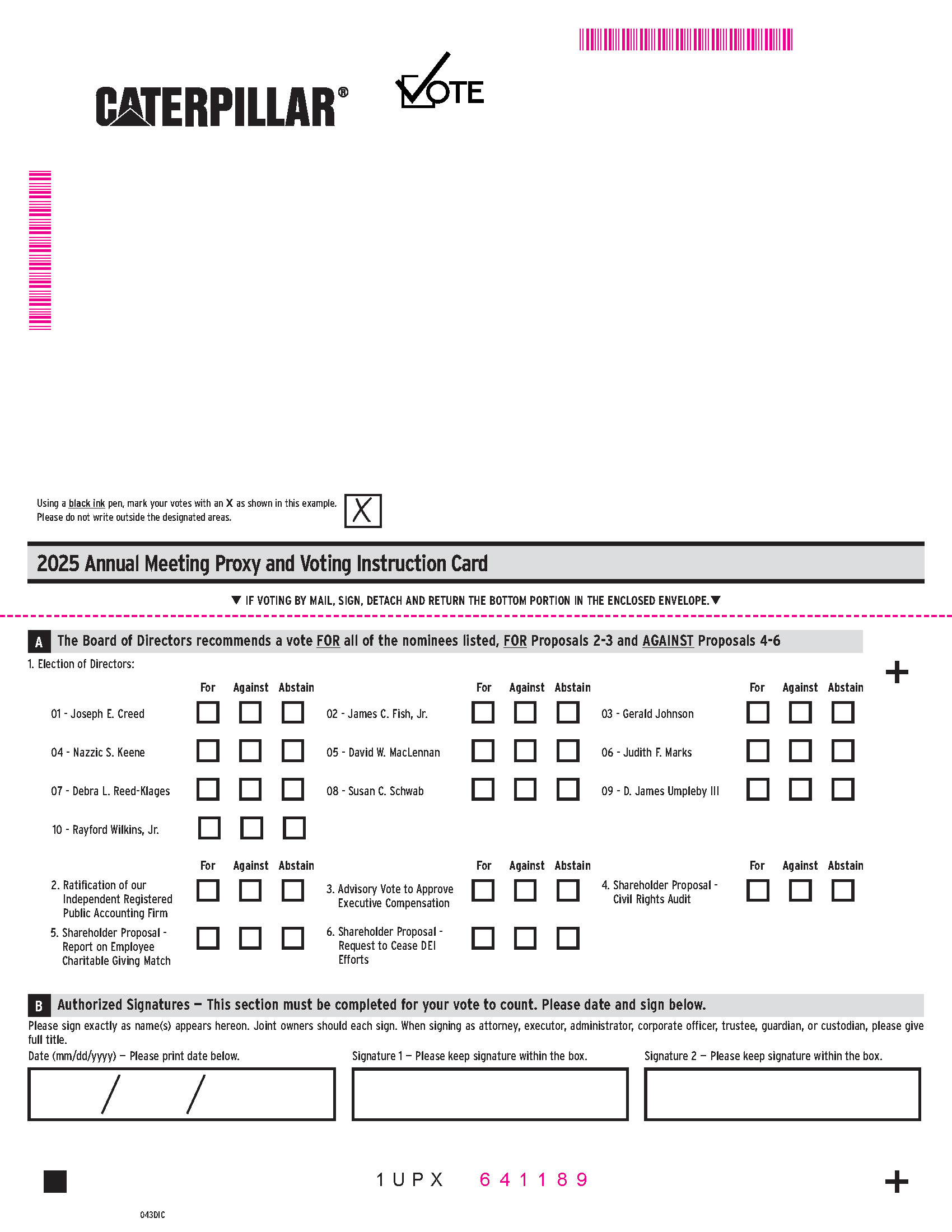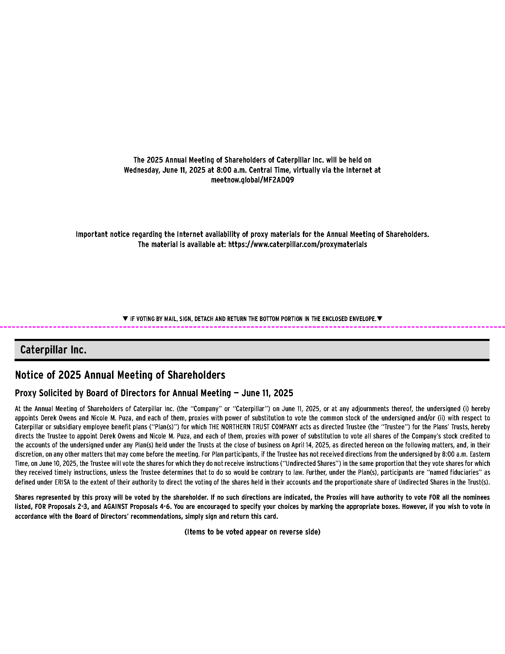 On behalf of the board of directors and our Caterpillar team, I cordially invite you to attend the Annual Meeting of Shareholders on June 11, 2025, at 8 a.m. Central Time. This year’s meeting will be held virtually.