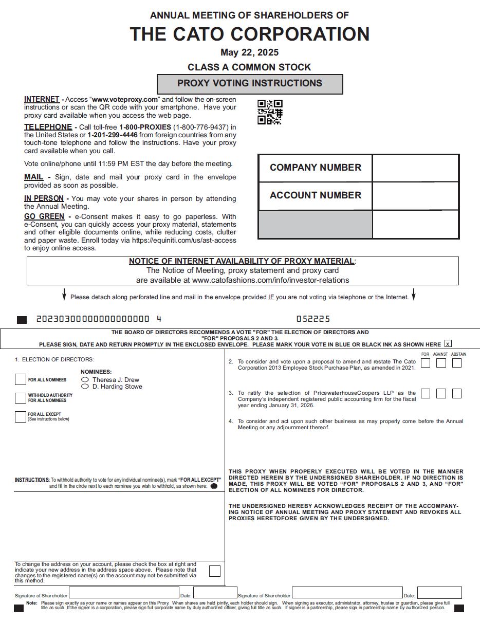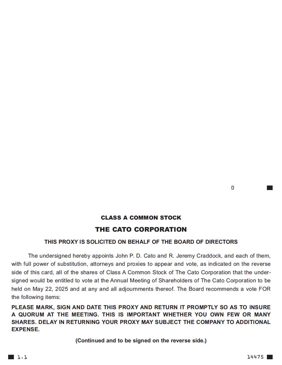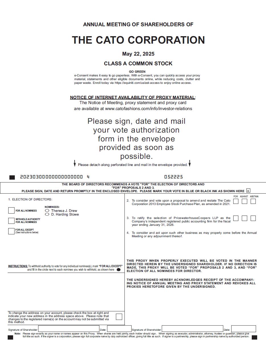 Notice is hereby given that the Annual Meeting of Shareholders of The Cato Corporation (the “Company”) will be held on Thursday, May 22, 2025 at 11:30 A.M., Eastern Time, at the Corporate Office of the Company, 8100 Denmark Road, Charlotte, North Carolina 28273, for the following purposes:
