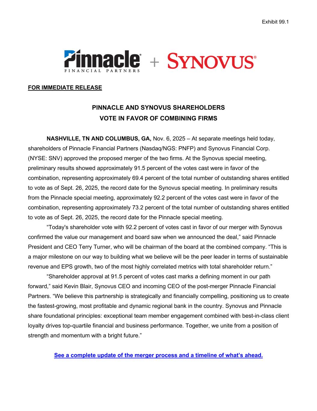 FOR IMMEDIATE RELEASE PINNACLE AND SYNOVUS SHAREHOLDERS VOTE IN FAVOR OF COMBINING FIRMS NASHVILLE, TN AND COLUMBUS, GA, Nov. 6, 2025 – At separate meetings held today, shareholders of Pinnacle Financial Partners (Nasdaq/NGS: PNFP) and Synovus Financial Corp. (NYSE: SNV) approved the proposed merger of the two firms. At the Synovus special meeting, preliminary results showed approximately 91.5 percent of the votes cast were in favor of the combination, representing approximately 69.4 percent of the total number of outstanding shares entitled to vote as of Sept. 26, 2025, the record date for the Synovus special meeting. In preliminary results from the Pinnacle special meeting, approximately 92.2 percent of the votes cast were in favor of the combination, representing approximately 73.2 percent of the total number of outstanding shares entitled to vote as of Sept. 26, 2025, the record date for the Pinnacle special meeting. “Today's shareholder vote with 92.2 percent of votes cast in favor of our merger with Synovus confirmed the value our management and board saw when we announced the deal,” said Pinnacle President and CEO Terry Turner, who will be chairman of the board at the combined company. “This is a major milestone on our way to building what we believe will be the peer leader in terms of sustainable revenue and EPS growth, two of the most highly correlated metrics with total shareholder return.” “Shareholder approval at 91.5 percent of votes cast marks a defining moment in our path forward,” said Kevin Blair, Synovus CEO and incoming CEO of the post-merger Pinnacle Financial Partners. “We believe this partnership is strategically and financially compelling, positioning us to create the fastest-growing, most profitable and dynamic regional bank in the country. Synovus and Pinnacle share foundational principles: exceptional team member engagement combined with best-in-class client loyalty drives top-quartile financial and business performance. Together, we unite from a position of strength and momentum with a bright future.” See a complete update of the merger process and a timeline of what’s ahead.