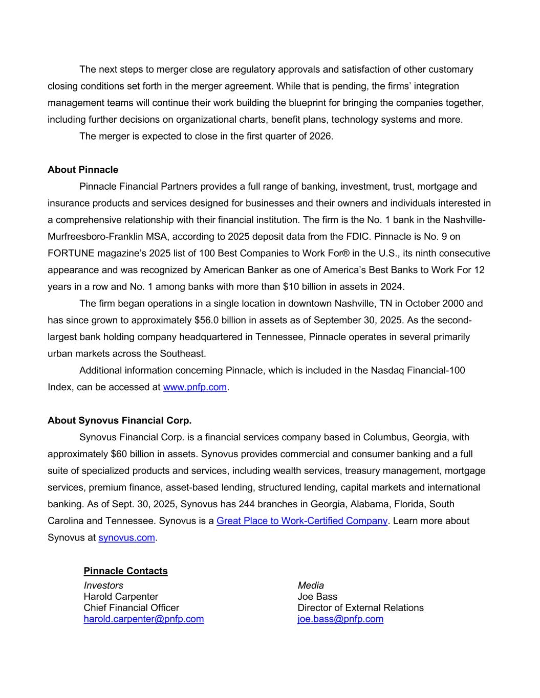 The next steps to merger close are regulatory approvals and satisfaction of other customary closing conditions set forth in the merger agreement. While that is pending, the firms’ integration management teams will continue their work building the blueprint for bringing the companies together, including further decisions on organizational charts, benefit plans, technology systems and more. The merger is expected to close in the first quarter of 2026. About Pinnacle Pinnacle Financial Partners provides a full range of banking, investment, trust, mortgage and insurance products and services designed for businesses and their owners and individuals interested in a comprehensive relationship with their financial institution. The firm is the No. 1 bank in the Nashville- Murfreesboro-Franklin MSA, according to 2025 deposit data from the FDIC. Pinnacle is No. 9 on FORTUNE magazine’s 2025 list of 100 Best Companies to Work For® in the U.S., its ninth consecutive appearance and was recognized by American Banker as one of America’s Best Banks to Work For 12 years in a row and No. 1 among banks with more than $10 billion in assets in 2024. The firm began operations in a single location in downtown Nashville, TN in October 2000 and has since grown to approximately $56.0 billion in assets as of September 30, 2025. As the second- largest bank holding company headquartered in Tennessee, Pinnacle operates in several primarily urban markets across the Southeast. Additional information concerning Pinnacle, which is included in the Nasdaq Financial-100 Index, can be accessed at www.pnfp.com. About Synovus Financial Corp. Synovus Financial Corp. is a financial services company based in Columbus, Georgia, with approximately $60 billion in assets. Synovus provides commercial and consumer banking and a full suite of specialized products and services, including wealth services, treasury management, mortgage services, premium finance, asset-based lending, structured lending, capital markets and international banking. As of Sept. 30, 2025, Synovus has 244 branches in Georgia, Alabama, Florida, South Carolina and Tennessee. Synovus is a Great Place to Work-Certified Company. Learn more about Synovus at synovus.com. Pinnacle Contacts Investors Harold Carpenter Chief Financial Officer harold.carpenter@pnfp.com Media Joe Bass Director of External Relations joe.bass@pnfp.com