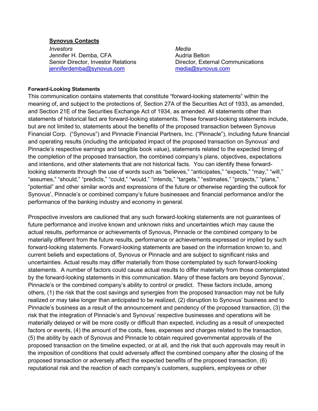 Synovus Contacts Investors Jennifer H. Demba, CFA Senior Director, Investor Relations jenniferdemba@synovus.com Media Audria Belton Director, External Communications media@synovus.com Forward-Looking Statements This communication contains statements that constitute “forward-looking statements” within the meaning of, and subject to the protections of, Section 27A of the Securities Act of 1933, as amended, and Section 21E of the Securities Exchange Act of 1934, as amended. All statements other than statements of historical fact are forward-looking statements. These forward-looking statements include, but are not limited to, statements about the benefits of the proposed transaction between Synovus Financial Corp. (“Synovus”) and Pinnacle Financial Partners, Inc. (“Pinnacle”), including future financial and operating results (including the anticipated impact of the proposed transaction on Synovus’ and Pinnacle’s respective earnings and tangible book value), statements related to the expected timing of the completion of the proposed transaction, the combined company’s plans, objectives, expectations and intentions, and other statements that are not historical facts. You can identify these forward- looking statements through the use of words such as “believes,” “anticipates,” “expects,” “may,” “will,” “assumes,” “should,” “predicts,” “could,” “would,” “intends,” “targets,” “estimates,” “projects,” “plans,” “potential” and other similar words and expressions of the future or otherwise regarding the outlook for Synovus’, Pinnacle’s or combined company’s future businesses and financial performance and/or the performance of the banking industry and economy in general. Prospective investors are cautioned that any such forward-looking statements are not guarantees of future performance and involve known and unknown risks and uncertainties which may cause the actual results, performance or achievements of Synovus, Pinnacle or the combined company to be materially different from the future results, performance or achievements expressed or implied by such forward-looking statements. Forward-looking statements are based on the information known to, and current beliefs and expectations of, Synovus or Pinnacle and are subject to significant risks and uncertainties. Actual results may differ materially from those contemplated by such forward-looking statements. A number of factors could cause actual results to differ materially from those contemplated by the forward-looking statements in this communication. Many of these factors are beyond Synovus’, Pinnacle’s or the combined company’s ability to control or predict. These factors include, among others, (1) the risk that the cost savings and synergies from the proposed transaction may not be fully realized or may take longer than anticipated to be realized, (2) disruption to Synovus’ business and to Pinnacle’s business as a result of the announcement and pendency of the proposed transaction, (3) the risk that the integration of Pinnacle’s and Synovus’ respective businesses and operations will be materially delayed or will be more costly or difficult than expected, including as a result of unexpected factors or events, (4) the amount of the costs, fees, expenses and charges related to the transaction, (5) the ability by each of Synovus and Pinnacle to obtain required governmental approvals of the proposed transaction on the timeline expected, or at all, and the risk that such approvals may result in the imposition of conditions that could adversely affect the combined company after the closing of the proposed transaction or adversely affect the expected benefits of the proposed transaction, (6) reputational risk and the reaction of each company’s customers, suppliers, employees or other