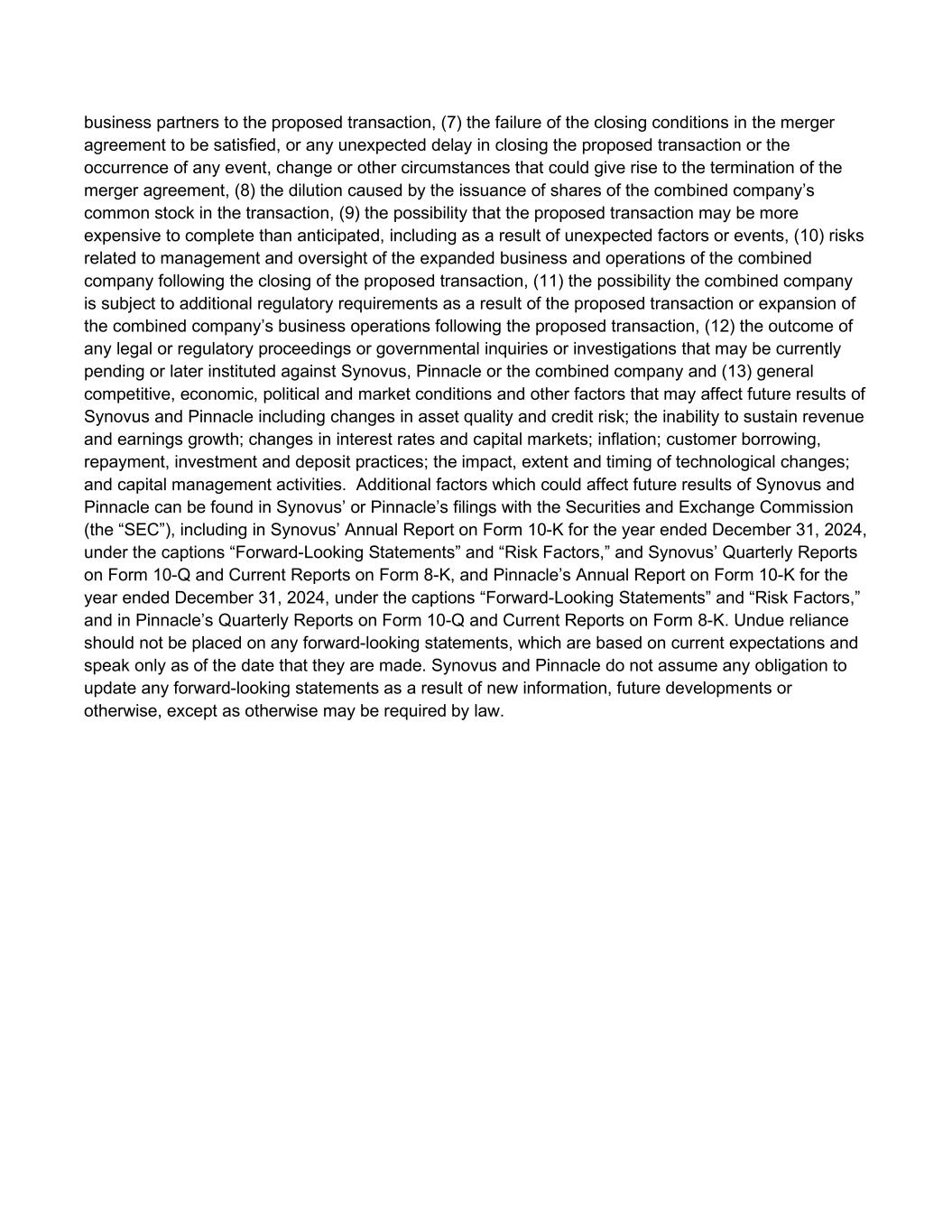 business partners to the proposed transaction, (7) the failure of the closing conditions in the merger agreement to be satisfied, or any unexpected delay in closing the proposed transaction or the occurrence of any event, change or other circumstances that could give rise to the termination of the merger agreement, (8) the dilution caused by the issuance of shares of the combined company’s common stock in the transaction, (9) the possibility that the proposed transaction may be more expensive to complete than anticipated, including as a result of unexpected factors or events, (10) risks related to management and oversight of the expanded business and operations of the combined company following the closing of the proposed transaction, (11) the possibility the combined company is subject to additional regulatory requirements as a result of the proposed transaction or expansion of the combined company’s business operations following the proposed transaction, (12) the outcome of any legal or regulatory proceedings or governmental inquiries or investigations that may be currently pending or later instituted against Synovus, Pinnacle or the combined company and (13) general competitive, economic, political and market conditions and other factors that may affect future results of Synovus and Pinnacle including changes in asset quality and credit risk; the inability to sustain revenue and earnings growth; changes in interest rates and capital markets; inflation; customer borrowing, repayment, investment and deposit practices; the impact, extent and timing of technological changes; and capital management activities. Additional factors which could affect future results of Synovus and Pinnacle can be found in Synovus’ or Pinnacle’s filings with the Securities and Exchange Commission (the “SEC”), including in Synovus’ Annual Report on Form 10-K for the year ended December 31, 2024, under the captions “Forward-Looking Statements” and “Risk Factors,” and Synovus’ Quarterly Reports on Form 10-Q and Current Reports on Form 8-K, and Pinnacle’s Annual Report on Form 10-K for the year ended December 31, 2024, under the captions “Forward-Looking Statements” and “Risk Factors,” and in Pinnacle’s Quarterly Reports on Form 10-Q and Current Reports on Form 8-K. Undue reliance should not be placed on any forward-looking statements, which are based on current expectations and speak only as of the date that they are made. Synovus and Pinnacle do not assume any obligation to update any forward-looking statements as a result of new information, future developments or otherwise, except as otherwise may be required by law.