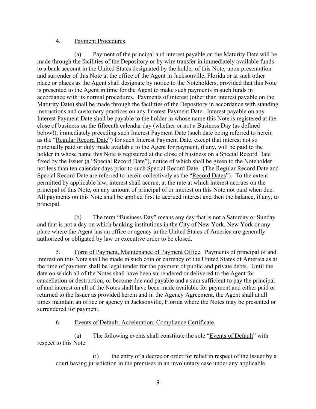 -9- 4. Payment Procedures. (a) Payment of the principal and interest payable on the Maturity Date will be made through the facilities of the Depository or by wire transfer in immediately available funds to a bank account in the United States designated by the holder of this Note, upon presentation and surrender of this Note at the office of the Agent in Jacksonville, Florida or at such other place or places as the Agent shall designate by notice to the Noteholders, provided that this Note is presented to the Agent in time for the Agent to make such payments in such funds in accordance with its normal procedures. Payments of interest (other than interest payable on the Maturity Date) shall be made through the facilities of the Depository in accordance with standing instructions and customary practices on any Interest Payment Date. Interest payable on any Interest Payment Date shall be payable to the holder in whose name this Note is registered at the close of business on the fifteenth calendar day (whether or not a Business Day (as defined below)), immediately preceding such Interest Payment Date (such date being referred to herein as the “Regular Record Date”) for such Interest Payment Date, except that interest not so punctually paid or duly made available to the Agent for payment, if any, will be paid to the holder in whose name this Note is registered at the close of business on a Special Record Date fixed by the Issuer (a “Special Record Date”), notice of which shall be given to the Noteholder not less than ten calendar days prior to such Special Record Date. (The Regular Record Date and Special Record Date are referred to herein collectively as the “Record Dates”). To the extent permitted by applicable law, interest shall accrue, at the rate at which interest accrues on the principal of this Note, on any amount of principal of or interest on this Note not paid when due. All payments on this Note shall be applied first to accrued interest and then the balance, if any, to principal. (b) The term “Business Day” means any day that is not a Saturday or Sunday and that is not a day on which banking institutions in the City of New York, New York or any place where the Agent has an office or agency in the United States of America are generally authorized or obligated by law or executive order to be closed. 5. Form of Payment, Maintenance of Payment Office. Payments of principal of and interest on this Note shall be made in such coin or currency of the United States of America as at the time of payment shall be legal tender for the payment of public and private debts. Until the date on which all of the Notes shall have been surrendered or delivered to the Agent for cancellation or destruction, or become due and payable and a sum sufficient to pay the principal of and interest on all of the Notes shall have been made available for payment and either paid or returned to the Issuer as provided herein and in the Agency Agreement, the Agent shall at all times maintain an office or agency in Jacksonville, Florida where the Notes may be presented or surrendered for payment. 6. Events of Default; Acceleration; Compliance Certificate. (a) The following events shall constitute the sole “Events of Default” with respect to this Note: (i) the entry of a decree or order for relief in respect of the Issuer by a court having jurisdiction in the premises in an involuntary case under any applicable