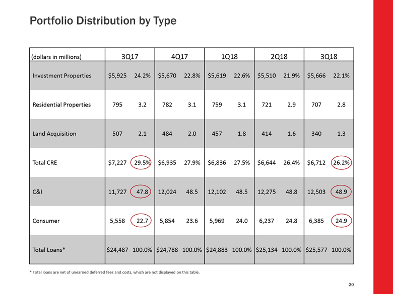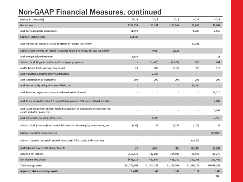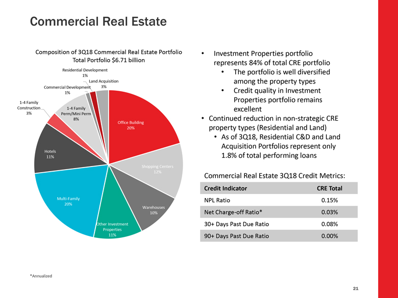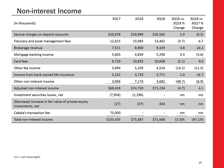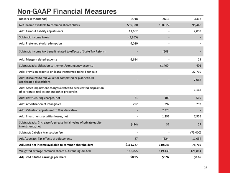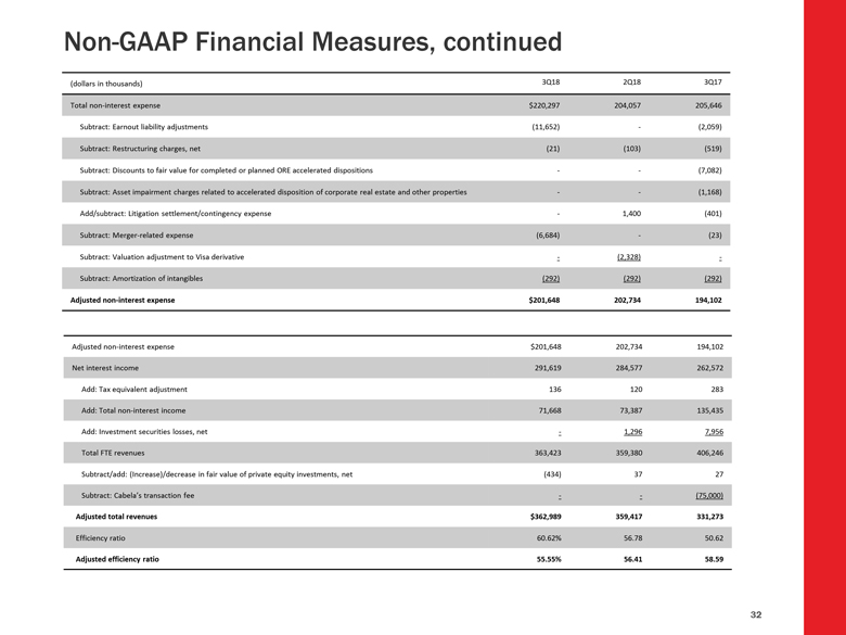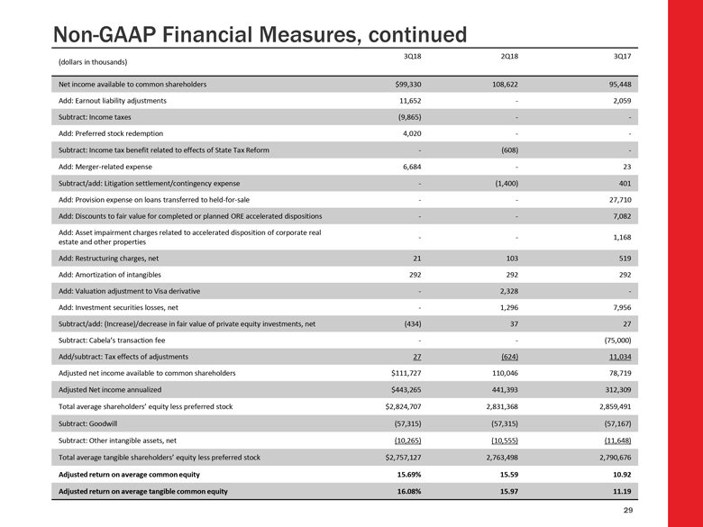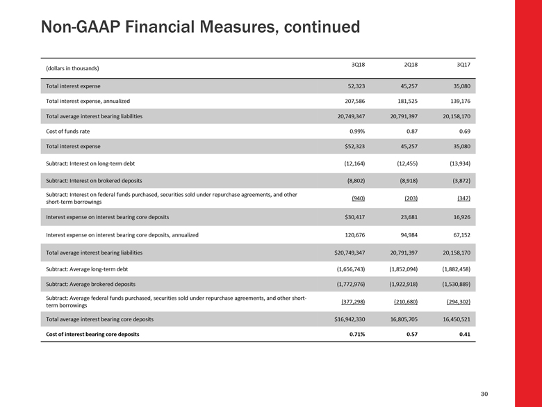 Non-GAAP Financial Measures, continued 33 (dollars in thousands) 3Q17 2Q18 3Q18 Total average deposits $25,286,919 26,268,074 26,387,312 Subtract: Average brokered deposits (1,530,889) (1,922,917) (1,772,977) Average core deposits $23,756,030 24,345,157 24,614,335 (dollars in thousands) 3Q17 4Q17 1Q18 2Q18 3Q18 Total assets 31,642,123 31,221,837 31,501,028 31,740,305 32,075,120 Subtract: Goodwill (57,315) (57,315) (57,315) (57,315) (57,315) Subtract: Other intangible assets, net (11,548) (11,254) (10,750) (10,458) (10,166) Tangible assets $31,573,260 $31,153,268 $31,432,963 $31,672,532 $32,007,639 Total shareholders’ equity $2,997,078 $2,961,566 $2,956,495 3,167,694 3,040,073 Subtract: Goodwill (57,315) (57,315) (57,315) (57,315) (57,315) Subtract: Other intangible assets, net (11,548) (11,254) (10,750) (10,458) (10,166) Subtract: Preferred Sock (125,980) (125,980) (125,980) (321,118) (195,138) Tangible common equity $2,802,235 $2,767,017 $2,762,450 $2,778,803 $2,777,454 Total shareholders’ equity to total assets ratio 9.47% 9.49% 9.39% 9.98% 9.48% Tangible Common Equity ratio 8.88% 8.88% 8.79% 8.77% 8.68% (dollars in thousands) 3Q18 Common equity Tier 1 (CET1) $2,846,417 Subtract: Adjustment related to capital components (2,785) Common equity Tier 1 (fully phased-in) $2,843,632 Total risk-weighted assets $28,701,637 Total risk-weighted assets (fully phased-in) $28,808,199 Common equity Tier 1 (CET1) ratio 9.92% Common equity Tier 1 (CET1) ratio (fully phased-in) 9.87%