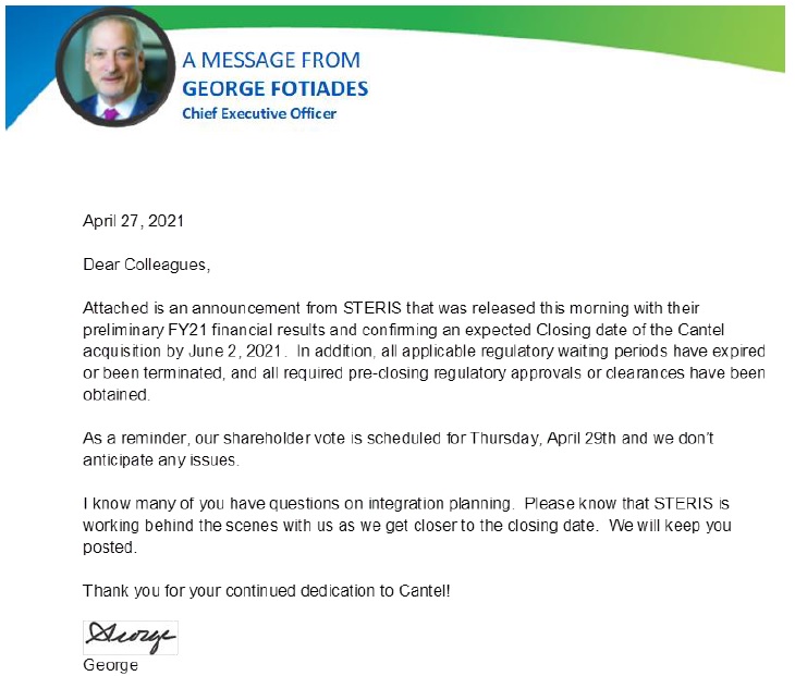 This communication contains “forward-looking statements” as that term is defined under the Private Securities Litigation Reform Act of 1995 and other securities laws, for which we claim the protection of the safe harbor for forward-looking statements contained in Section 27A of the Securities Act of 1933 and Section 21E of the Securities Exchange Act of 1934. Such forward-looking statements include, but are not limited to, statements about the benefits of the acquisition of Cantel by STERIS, including future financial and operating results, Cantel’s or STERIS’s plans, objectives, expectations and intentions and the expected timing of completion of the transaction. These statements are based on current expectations, estimates, or forecasts about our businesses, the industries in which we operate, and the current beliefs and assumptions of management; they do not relate strictly to historical or current facts. Without limiting the foregoing, words or phrases such as “expect,” “anticipate,” “goal,” “project,” “intend,” “plan,” “believe,” “seek,” “may,” “could,” “enable,” and “opportunity” and variations of such words and similar expressions generally identify forward-looking statements. Risks and uncertainties associated with these forward-looking statements include the potential that we may not be able to consummate the transaction, or that the expected benefits and opportunities of the transaction may not be realized or may take longer to realize than expected, or that required regulatory approvals may not be obtained as quickly as expected, or at all. There are also risks and uncertainties related to the subsequent integration of the companies; the ability to recognize the anticipated synergies and benefits of the acquisition; restructuring in connection with, and successful closing of, the transaction; the ability to obtain required regulatory approvals for the transaction (including the approval of antitrust authorities necessary to complete the acquisition); the timing of obtaining such approvals and the risk that such approvals may result in the imposition of conditions that could adversely affect the combined company or the expected benefits of the transaction; the ability to obtain the requisite Cantel shareholder approval; the risk that a condition to closing of the transaction may not be satisfied on a timely basis or at all; the failure of the transaction to close for any other reason; risks relating to the value of the STERIS shares to be issued in the transaction; access to available financing (including financing for the transaction) on a timely basis and on reasonable terms; the impact of competitive products and pricing; the impact of the COVID-19 pandemic on our operations and financial results; general economic conditions; and technological and market changes in our industry. We caution that undue reliance should not be placed on such forward-looking statements, which speak only as of the date made. Some of the factors which could cause results to differ from those expressed in any forward-looking statement are set forth in our most recent Annual Report on Form 10-K, which we may update in Quarterly Reports on Form 10-Q we have filed or will file hereafter. We expressly disclaim any obligation or undertaking to release publicly any updates or revisions to any forward-looking statements contained herein to reflect any change in our expectations with regard thereto or any change in events, conditions or circumstances on which any such statement is based. This cautionary statement is applicable to all forward-looking statements contained in this communication.