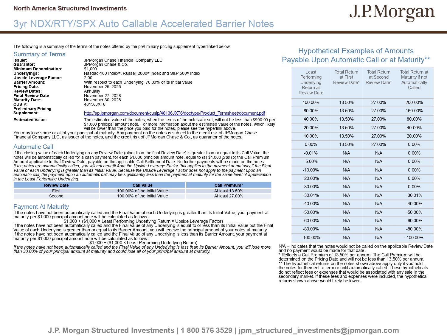 North America Structured Investments 3yr NDX/RTY/SPX Auto Callable Accelerated Barrier Notes The following is a summary of the terms of the notes offered by the preliminary pricing supplement hyperlinked below. Summary of Terms J.P. Morgan Structured Investments | 1 800 576 3529 | jpm_structured_investments@jpmorgan.com JPMorgan Chase Financial Company LLC JPMorgan Chase & Co. $1,000 ® ® ® Nasdaq - 100 Index , Russell 2000 Index and S&P 500 Index Issuer: Guarantor: Minimum Denomination: Underlyings: Upside Leverage Factor: Barrier Amount : Pricing Date: Review Dates : Final Review Date : Maturity Date: CUSIP: Preliminary Pricing Supplement: Estimated Value: 2.00 With respect to each Underlying, 70.00% of its Initial Value November 25, 2025 Annually November 27, 2028 November 30, 2028 48136JXT6 http://sp.jpmorgan.com/document/cusip/48136JXT6/doctype/Product_Termsheet/document.pdf The estimated value of the notes, when the terms of the notes are set, will not be less than $900.00 per $1,000 principal amount note. For more information about the estimated value of the notes, which likely will be lower than the price you paid for the notes, please see the hyperlink above. You may lose some or all of your principal at maturity. Any payment on the notes is subject to the credit risk of JPMorgan Chase Financial Company LLC, as issuer of the notes, and the credit risk of JPMorgan Chase & Co., as guarantor of the notes. Automatic Call If the closing value of each Underlying on any Review Date (other than the final Review Date) is greater than or equal to its Call Value, the notes will be automatically called for a cash payment, for each $ 1 , 000 principal amount note, equal to (a) $ 1 , 000 plus (b) the Call Premium Amount applicable to that Review Date, payable on the applicable Call Settlement Date . No further payments will be made on the notes . If the notes are automatically called, you will not benefit from the Upside Leverage Factor that applies to the payment at maturity if the Final Value of each Underlying is greater than its Initial Value. Because the Upside Leverage Factor does not apply to the payment upon an automatic call, the payment upon an automatic call may be significantly less than the payment at maturity for the same level of appreciation in the Least Performing Underlying. Call Premium* Call Value Review Date At least 13.50% 100.00% of the Initial Value First At least 27.00% 100.00% of the Initial Value Second Payment At Maturity If the notes have not been automatically called and the Final Value of each Underlying is greater than its Initial Value, your payment at maturity per $1,000 principal amount note will be calculated as follows: $1,000 + ($1,000 î Least Performing Underlying Return î Upside Leverage Factor) If the notes have not been automatically called and the Final Value of any Underlying is equal to or less than its Initial Value but the Final Value of each Underlying is greater than or equal to its Barrier Amount, you will receive the principal amount of your notes at maturity. If the notes have not been automatically called and the Final Value of any Underlying is less than its Barrier Amount, your payment at maturity per $1,000 principal amount note will be calculated as follows: $1,000 + ($1,000 î Least Performing Underlying Return) If the notes have not been automatically called and the Final Value of any Underlying is less than its Barrier Amount, you will lose more than 30.00% of your principal amount at maturity and could lose all of your principal amount at maturity. Hypothetical Examples of Amounts Payable Upon Automatic Call or at Maturity** Total Return at Maturity if not Automatically Called Total Return at Second Review Date* Total Return at First Review Date* Least Performing Underlying Return at Review Date 200.00% 27.00% 13.50% 100.00% 160.00% 27.00% 13.50% 80.00% 80.00% 27.00% 13.50% 40.00% 40.00% 27.00% 13.50% 20.00% 20.00% 27.00% 13.50% 10.00% 0.00% 27.00% 13.50% 0.00% 0.00% N/A N/A - 0.01% 0.00% N/A N/A - 5.00% 0.00% N/A N/A - 10.00% 0.00% N/A N/A - 20.00% 0.00% N/A N/A - 30.00% - 30.01% N/A N/A - 30.01% - 40.00% N/A N/A - 40.00% - 50.00% N/A N/A - 50.00% - 60.00% N/A N/A - 60.00% - 80.00% N/A N/A - 80.00% - 100.00% N/A N/A - 100.00% N/A – indicates that the notes would not be called on the applicable Review Date and no payment would be made for that date. * Reflects a Call Premium of 13.50% per annum. The Call Premium will be determined on the Pricing Date and will not be less than 13.50% per annum. ** The hypothetical returns on the notes shown above apply only if you hold the notes for their entire term or until automatically called. These hypotheticals do not reflect fees or expenses that would be associated with any sale in the secondary market. If these fees and expenses were included, the hypothetical returns shown above would likely be lower.