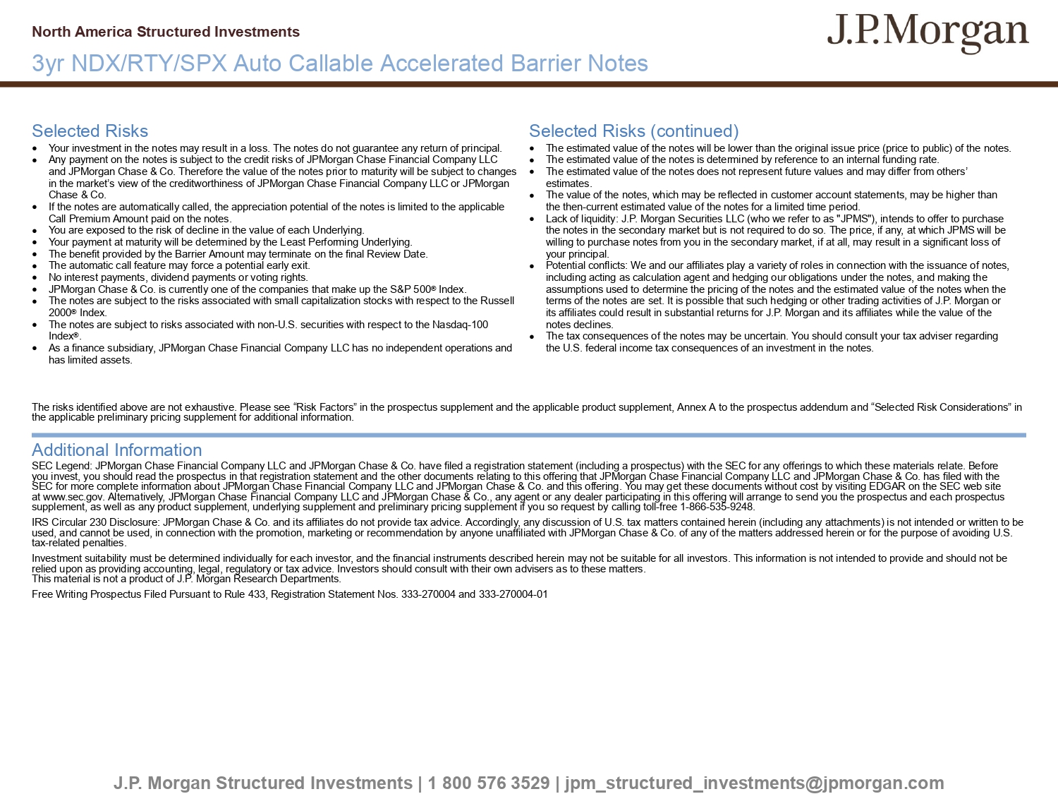 North America Structured Investments 3yr NDX/RTY/SPX Auto Callable Accelerated Barrier Notes Selected Risks Ɣ Ɣ Your investment in the notes may result in a loss. The notes do not guarantee any return of principal. Any payment on the notes is subject to the credit risks of JPMorgan Chase Financial Company LLC and JPMorgan Chase & Co. Therefore the value of the notes prior to maturity will be subject to changes in the market’s view of the creditworthiness of JPMorgan Chase Financial Company LLC or JPMorgan Chase & Co. If the notes are automatically called, the appreciation potential of the notes is limited to the applicable Call Premium Amount paid on the notes. You are exposed to the risk of decline in the value of each Underlying. Your payment at maturity will be determined by the Least Performing Underlying. The benefit provided by the Barrier Amount may terminate on the final Review Date. The automatic call feature may force a potential early exit. No interest payments, dividend payments or voting rights. JPMorgan Chase & Co. is currently one of the companies that make up the S&P 500 ® Index. The notes are subject to the risks associated with small capitalization stocks with respect to the Russell 2000 ® Index. The notes are subject to risks associated with non - U.S. securities with respect to the Nasdaq - 100 Index ® . As a finance subsidiary, JPMorgan Chase Financial Company LLC has no independent operations and has limited assets. Ɣ Ɣ Ɣ Ɣ Ɣ Ɣ Ɣ Ɣ Ɣ Ɣ Selected Risks (continued) Ɣ Ɣ Ɣ The estimated value of the notes will be lower than the original issue price (price to public) of the notes. The estimated value of the notes is determined by reference to an internal funding rate. The estimated value of the notes does not represent future values and may differ from others’ estimates. The value of the notes, which may be reflected in customer account statements, may be higher than the then - current estimated value of the notes for a limited time period. Lack of liquidity: J.P. Morgan Securities LLC (who we refer to as "JPMS"), intends to offer to purchase the notes in the secondary market but is not required to do so. The price, if any, at which JPMS will be willing to purchase notes from you in the secondary market, if at all, may result in a significant loss of your principal. Potential conflicts: We and our affiliates play a variety of roles in connection with the issuance of notes, including acting as calculation agent and hedging our obligations under the notes, and making the assumptions used to determine the pricing of the notes and the estimated value of the notes when the terms of the notes are set. It is possible that such hedging or other trading activities of J.P. Morgan or its affiliates could result in substantial returns for J.P. Morgan and its affiliates while the value of the notes declines. The tax consequences of the notes may be uncertain. You should consult your tax adviser regarding the U.S. federal income tax consequences of an investment in the notes. Ɣ Ɣ Ɣ Ɣ The risks identified above are not exhaustive. Please see “Risk Factors” in the prospectus supplement and the applicable product supplement, Annex A to the prospectus addendum and “Selected Risk Considerations” in the applicable preliminary pricing supplement for additional information. Additional Information SEC Legend: JPMorgan Chase Financial Company LLC and JPMorgan Chase & Co. have filed a registration statement (including a prospectus) with the SEC for any offerings to which these materials relate. Before you invest, you should read the prospectus in that registration statement and the other documents relating to this offering that JPMorgan Chase Financial Company LLC and JPMorgan Chase & Co. has filed with the SEC for more complete information about JPMorgan Chase Financial Company LLC and JPMorgan Chase & Co. and this offering. You may get these documents without cost by visiting EDGAR on the SEC web site at www.sec.gov. Alternatively, JPMorgan Chase Financial Company LLC and JPMorgan Chase & Co., any agent or any dealer participating in this offering will arrange to send you the prospectus and each prospectus supplement, as well as any product supplement, underlying supplement and preliminary pricing supplement if you so request by calling toll - free 1 - 866 - 535 - 9248. IRS Circular 230 Disclosure: JPMorgan Chase & Co. and its affiliates do not provide tax advice. Accordingly, any discussion of U.S. tax matters contained herein (including any attachments) is not intended or written to be used, and cannot be used, in connection with the promotion, marketing or recommendation by anyone unaffiliated with JPMorgan Chase & Co. of any of the matters addressed herein or for the purpose of avoiding U.S. tax - related penalties. Investment suitability must be determined individually for each investor, and the financial instruments described herein may not be suitable for all investors. This information is not intended to provide and should not be relied upon as providing accounting, legal, regulatory or tax advice. Investors should consult with their own advisers as to these matters. This material is not a product of J.P. Morgan Research Departments. Free Writing Prospectus Filed Pursuant to Rule 433, Registration Statement Nos. 333 - 270004 and 333 - 270004 - 01 J.P. Morgan Structured Investments | 1 800 576 3529 | jpm_structured_investments@jpmorgan.com