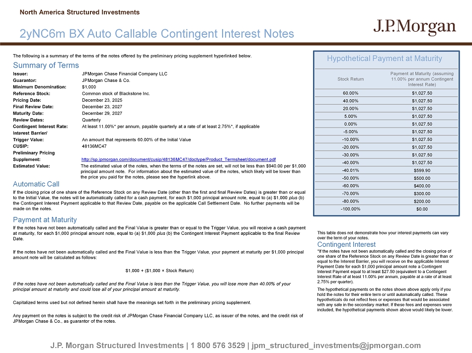 The following is a summary of the terms of the notes offered by the preliminary pricing supplement hyperlinked below. Summary of Terms Issuer: JPMorgan Chase Financial Company LLC Guarantor: JPMorgan Chase & Co. Minimum Denomination: $1,000 Reference Stock: Common stock of Blackstone Inc. Pricing Date: December 23, 2025 Final Review Date: December 23, 2027 Maturity Date: December 29, 2027 Review Dates: Quarterly Contingent Interest Rate: At least 11.00%* per annum, payable quarterly at a rate of at least 2.75%*, if applicable Interest Barrier/ Trigger Value: An amount that represents 60.00% of the Initial Value CUSIP: 48136MC47 Preliminary Pricing Supplement: http://sp.jpmorgan.com/document/cusip/48136MC47/doctype/Product_Termsheet/document.pdf Estimated Value: The estimated value of the notes, when the terms of the notes are set, will not be less than $940.00 per $1,000 principal amount note. For information about the estimated value of the notes, which likely will be lower than the price you paid for the notes, please see the hyperlink above. Automatic Call If the closing price of one share of the Reference Stock on any Review Date (other than the first and final Review Dates) is gre ater than or equal to the Initial Value, the notes will be automatically called for a cash payment, for each $1,000 principal amount note, equal to (a) $1,000 plus (b) the Contingent Interest Payment applicable to that Review Date, payable on the applicable Call Settlement Date. No further p aym ents will be made on the notes. Payment at Maturity If the notes have not been automatically called and the Final Value is greater than or equal to the Trigger Value, you will r ece ive a cash payment at maturity, for each $1,000 principal amount note, equal to (a) $1,000 plus (b) the Contingent Interest Payment applicable to the final Review Date. If the notes have not been automatically called and the Final Value is less than the Trigger Value, your payment at maturity per $1,000 principal amount note will be calculated as follows: $1,000 + ($1,000 î Stock Return) If the notes have not been automatically called and the Final Value is less than the Trigger Value, you will lose more than 4 0.0 0% of your principal amount at maturity and could lose all of your principal amount at maturity. Capitalized terms used but not defined herein shall have the meanings set forth in the preliminary pricing supplement. Any payment on the notes is subject to the credit risk of JPMorgan Chase Financial Company LLC, as issuer of the notes, and t he credit risk of JPMorgan Chase & Co., as guarantor of the notes. Hypothetical Payment at Maturity J.P. Morgan Structured Investments | 1 800 576 3529 | jpm_structured_inv e stments@jpmorgan.com 2yNC6m BX Auto Callable Contingent Interest Notes North America Structured Investments Payment at Maturity (assuming 11.00% per annum Contingent Interest Rate) Stock Return $1,027.50 60.00% $1,027.50 40.00% $1,027.50 20.00% $1,027.50 5.00% $1,027.50 0.00% $1,027.50 - 5.00% $1,027.50 - 10.00% $1,027.50 - 20.00% $1,027.50 - 30.00% $1,027.50 - 40.00% $599.90 - 40.01% $500.00 - 50.00% $400.00 - 60.00% $300.00 - 70.00% $200.00 - 80.00% $0.00 - 100.00% This table does not demonstrate how your interest payments can vary over the term of your notes. Contingent Interest *If the notes have not been automatically called and the closing price of one share of the Reference Stock on any Review Date is greater than or equal to the Interest Barrier, you will receive on the applicable Interest Payment Date for each $1,000 principal amount note a Contingent Interest Payment equal to at least $27.50 (equivalent to a Contingent Interest Rate of at least 11.00% per annum, payable at a rate of at least 2.75% per quarter). The hypothetical payments on the notes shown above apply only if you hold the notes for their entire term or until automatically called. These hypotheticals do not reflect fees or expenses that would be associated with any sale in the secondary market. If these fees and expenses were included, the hypothetical payments shown above would likely be lower.