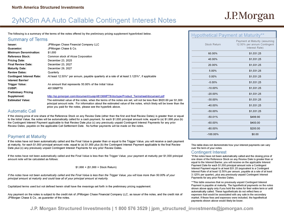 The following is a summary of the terms of the notes offered by the preliminary pricing supplement hyperlinked below. Summary of Terms Issuer: JPMorgan Chase Financial Company LLC Guarantor: JPMorgan Chase & Co. Minimum Denomination: $1,000 Reference Stock: Common stock of Alcoa Corporation Pricing Date: December 23, 2025 Final Review Date: December 23, 2027 Maturity Date: December 29, 2027 Review Dates: Quarterly Contingent Interest Rate: At least 12.50%* per annum, payable quarterly at a rate of at least 3.125%*, if applicable Interest Barrier/ Trigger Value: An amount that represents 50.00% of the Initial Value CUSIP: 48136MPT8 Preliminary Pricing Supplement: http://sp.jpmorgan.com/document/cusip/48136MPT8/doctype/Product_Termsheet/document.pdf Estimated Value: The estimated value of the notes, when the terms of the notes are set, will not be less than $920.00 per $1,000 principal amount note. For information about the estimated value of the notes, which likely will be lower than the price you paid for the notes, please see the hyperlink above. Automatic Call If the closing price of one share of the Reference Stock on any Review Date (other than the first and final Review Dates) is gre ater than or equal to the Initial Value, the notes will be automatically called for a cash payment, for each $1,000 principal amount note, equal to (a) $1,000 plus (b) the Contingent Interest Payment applicable to that Review Date plus (c) any previously unpaid Contingent Interest Payments for any prior Review Dates, payable on the applicable Call Settlement Date. No further payments will be made on the notes. Payment at Maturity If the notes have not been automatically called and the Final Value is greater than or equal to the Trigger Value, you will r ece ive a cash payment at maturity, for each $1,000 principal amount note, equal to (a) $1,000 plus (b) the Contingent Interest Payment applicable to the final Review Date plus (c) any previously unpaid Contingent Interest Payments for any prior Review Dates. If the notes have not been automatically called and the Final Value is less than the Trigger Value, your payment at maturity per $1,000 principal amount note will be calculated as follows: $1,000 + ($1,000 î Stock Return) If the notes have not been automatically called and the Final Value is less than the Trigger Value, you will lose more than 5 0.0 0% of your principal amount at maturity and could lose all of your principal amount at maturity. Capitalized terms used but not defined herein shall have the meanings set forth in the preliminary pricing supplement. Any payment on the notes is subject to the credit risk of JPMorgan Chase Financial Company LLC, as issuer of the notes, and t he credit risk of JPMorgan Chase & Co., as guarantor of the notes. Hypothetical Payment at Maturity** J.P. Morgan Structured Investments | 1 800 576 3529 | jpm_structured_inv e stments@jpmorgan.com 2yNC6m AA Auto Callable Contingent Interest Notes North America Structured Investments Payment at Maturity (assuming 12.50% per annum Contingent Interest Rate) Stock Return $1,031.25 60.00% $1,031.25 40.00% $1,031.25 20.00% $1,031.25 5.00% $1,031.25 0.00% $1,031.25 - 5.00% $1,031.25 - 10.00% $1,031.25 - 20.00% $1,031.25 - 30.00% $1,031.25 - 40.00% $1,031.25 - 50.00% $499.90 - 50.01% $400.00 - 60.00% $200.00 - 80.00% $0.00 - 100.00% This table does not demonstrate how your interest payments can vary over the term of your notes. Contingent Interest *If the notes have not been automatically called and the closing price of one share of the Reference Stock on any Review Date is greater than or equal to the Interest Barrier, you will receive on the applicable Interest Payment Date for each $1,000 principal amount note a Contingent Interest Payment equal to at least $31.25 (equivalent to a Contingent Interest Rate of at least 12.50% per annum, payable at a rate of at least 3.125% per quarter), plus any previously unpaid Contingent Interest Payments for any prior Review Dates. **This table assumes that no previously unpaid Contingent Interest Payment is payable at maturity. The hypothetical payments on the notes shown above apply only if you hold the notes for their entire term or until automatically called. These hypotheticals do not reflect fees or expenses that would be associated with any sale in the secondary market. If these fees and expenses were included, the hypothetical payments shown above would likely be lower.