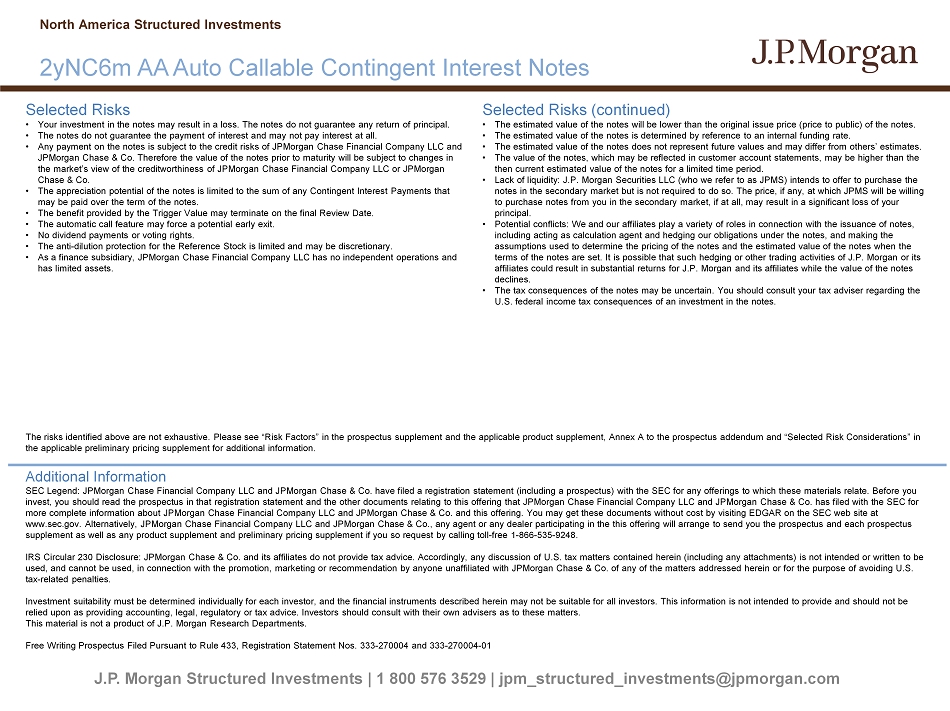 J.P. Morgan Structured Investments | 1 800 576 3529 | jpm_structured_investments@jpmorgan.com Selected Risks • Your investment in the notes may result in a loss. The notes do not guarantee any return of principal. • The notes do not guarantee the payment of interest and may not pay interest at all. • Any payment on the notes is subject to the credit risks of JPMorgan Chase Financial Company LLC and JPMorgan Chase & Co. Therefore the value of the notes prior to maturity will be subject to changes in the market’s view of the creditworthiness of JPMorgan Chase Financial Company LLC or JPMorgan Chase & Co. • The appreciation potential of the notes is limited to the sum of any Contingent Interest Payments that may be paid over the term of the notes. • The benefit provided by the Trigger Value may terminate on the final Review Date. • The automatic call feature may force a potential early exit. • No dividend payments or voting rights. • The anti - dilution protection for the Reference Stock is limited and may be discretionary. • As a finance subsidiary, JPMorgan Chase Financial Company LLC has no independent operations and has limited assets. Selected Risks (continued) • The estimated value of the notes will be lower than the original issue price (price to public) of the notes. • The estimated value of the notes is determined by reference to an internal funding rate. • The estimated value of the notes does not represent future values and may differ from others’ estimates. • The value of the notes, which may be reflected in customer account statements, may be higher than the then current estimated value of the notes for a limited time period. • Lack of liquidity: J.P. Morgan Securities LLC (who we refer to as JPMS) intends to offer to purchase the notes in the secondary market but is not required to do so. The price, if any, at which JPMS will be willing to purchase notes from you in the secondary market, if at all, may result in a significant loss of your principal. • Potential conflicts: We and our affiliates play a variety of roles in connection with the issuance of notes, including acting as calculation agent and hedging our obligations under the notes, and making the assumptions used to determine the pricing of the notes and the estimated value of the notes when the terms of the notes are set. It is possible that such hedging or other trading activities of J.P. Morgan or its affiliates could result in substantial returns for J.P. Morgan and its affiliates while the value of the notes declines. • The tax consequences of the notes may be uncertain. You should consult your tax adviser regarding the U.S. federal income tax consequences of an investment in the notes. Additional Information SEC Legend: JPMorgan Chase Financial Company LLC and JPMorgan Chase & Co. have filed a registration statement (including a pr osp ectus) with the SEC for any offerings to which these materials relate. Before you invest, you should read the prospectus in that registration statement and the other documents relating to this offering that JPM organ Chase Financial Company LLC and JPMorgan Chase & Co. has filed with the SEC for more complete information about JPMorgan Chase Financial Company LLC and JPMorgan Chase & Co. and this offering. You may get the se documents without cost by visiting EDGAR on the SEC web site at www.sec.gov. Alternatively, JPMorgan Chase Financial Company LLC and JPMorgan Chase & Co., any agent or any dealer participat ing in the this offering will arrange to send you the prospectus and each prospectus supplement as well as any product supplement and preliminary pricing supplement if you so request by calling toll - free 1 - 866 - 535 - 9248. IRS Circular 230 Disclosure: JPMorgan Chase & Co. and its affiliates do not provide tax advice. Accordingly, any discussion o f U .S. tax matters contained herein (including any attachments) is not intended or written to be used, and cannot be used, in connection with the promotion, marketing or recommendation by anyone unaffiliated with JPMorgan Cha se & Co. of any of the matters addressed herein or for the purpose of avoiding U.S. tax - related penalties. Investment suitability must be determined individually for each investor, and the financial instruments described herein may not be suitable for all investors. This information is not intended to provide and should not be relied upon as providing accounting, legal, regulatory or tax advice. Investors should consult with their own advisers as to the se matters. This material is not a product of J.P. Morgan Research Departments. Free Writing Prospectus Filed Pursuant to Rule 433, Registration Statement Nos. 333 - 270004 and 333 - 270004 - 01 North America Structured Investments 2yNC6m AA Auto Callable Contingent Interest Notes The risks identified above are not exhaustive. Please see “Risk Factors” in the prospectus supplement and the applicable prod uct supplement, Annex A to the prospectus addendum and “Selected Risk Considerations” in the applicable preliminary pricing supplement for additional information.