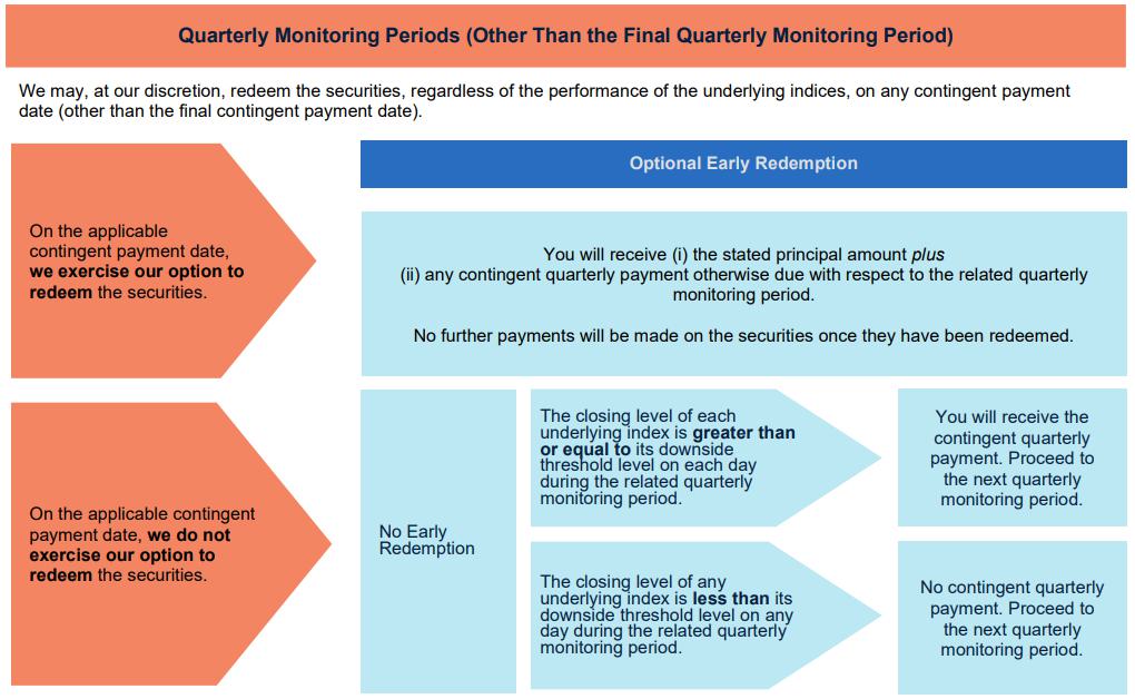 | Optional early redemption: | We, at our discretion, may redeem the securities early, in whole but not in part, on any of the contingent payment dates (other than the final contingent payment date) for the early redemption payment. If we intend to redeem your securities early, we will deliver notice to The Depository Trust Company, or DTC, at least three business days before the applicable contingent payment date. Any early redemption of the securities will be at our discretion and will not automatically occur based on the performance of the underlying indices. No further payments will be made on the securities once they have been redeemed. | |
