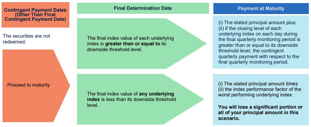 If the final index value of each underlying index is greater than or equal to its downside threshold level: the stated principal amount and, if the closing level of each underlying index on each day of the final quarterly monitoring period is greater than or equal to its downside threshold level, the contingent quarterly payment with respect to the final quarterly monitoring period. If the final index value of any underlying index is less than its downside threshold level: (i) the stated principal amount times (ii) the index performance factor of the worst performing underlying index. |