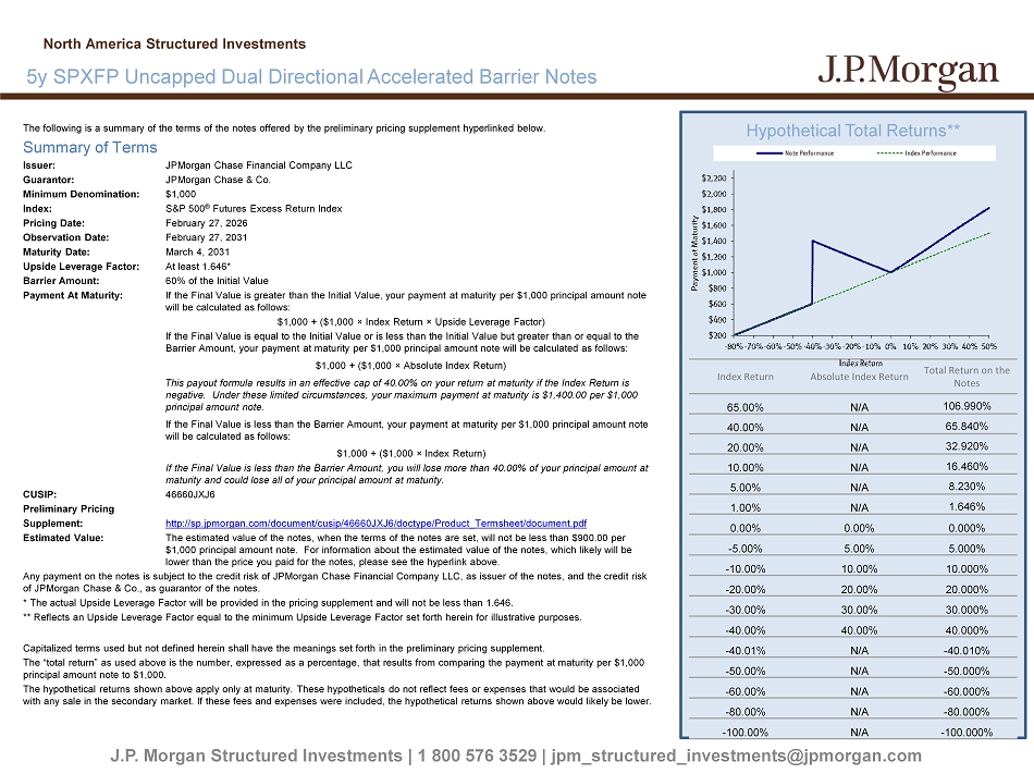 The following is a summary of the terms of the notes offered by the preliminary pricing supplement hyperlinked below. Summary of Terms Issuer: JPMorgan Chase Financial Company LLC Guarantor: JPMorgan Chase & Co. Minimum Denomination: $1,000 Index: S&P 500 ® Futures Excess Return Index Pricing Date: February 27, 2026 Observation Date: February 27, 2031 Maturity Date: March 4, 2031 Upside Leverage Factor: At least 1.646* Barrier Amount: 60% of the Initial Value Payment At Maturity: If the Final Value is greater than the Initial Value, your payment at maturity per $1,000 principal amount note will be calculated as follows: $1,000 + ($1,000 î Index Return î Upside Leverage Factor) If the Final Value is equal to the Initial Value or is less than the Initial Value but greater than or equal to the Barrier Amount, your payment at maturity per $1,000 principal amount note will be calculated as follows: $1,000 + ($1,000 î Absolute Index Return) This payout formula results in an effective cap of 40.00% on your return at maturity if the Index Return is negative. Under these limited circumstances, your maximum payment at maturity is $1,400.00 per $1,000 principal amount note. If the Final Value is less than the Barrier Amount, your payment at maturity per $1,000 principal amount note will be calculated as follows: $1,000 + ($1,000 î Index Return) If the Final Value is less than the Barrier Amount, you will lose more than 40.00% of your principal amount at maturity and could lose all of your principal amount at maturity. CUSIP: 46660JXJ6 Preliminary Pricing Supplement: http://sp.jpmorgan.com/document/cusip/46660JXJ6/doctype/Product_Termsheet/document.pdf Estimated Value: The estimated value of the notes, when the terms of the notes are set, will not be less than $900.00 per $1,000 principal amount note. For information about the estimated value of the notes, which likely will be lower than the price you paid for the notes, please see the hyperlink above. Any payment on the notes is subject to the credit risk of JPMorgan Chase Financial Company LLC, as issuer of the notes, and t he credit risk of JPMorgan Chase & Co., as guarantor of the notes. * The actual Upside Leverage Factor will be provided in the pricing supplement and will not be less than 1.646. ** Reflects an Upside Leverage Factor equal to the minimum Upside Leverage Factor set forth herein for illustrative purposes. Capitalized terms used but not defined herein shall have the meanings set forth in the preliminary pricing supplement. The “total return” as used above is the number, expressed as a percentage, that results from comparing the payment at maturit y p er $1,000 principal amount note to $1,000. The hypothetical returns shown above apply only at maturity. These hypotheticals do not reflect fees or expenses that would b e a ssociated with any sale in the secondary market. If these fees and expenses were included, the hypothetical returns shown above would l ike ly be lower. J.P. Morgan Structured Investments | 1 800 576 3529 | jpm_structured_investments@jpmorgan.com 5y SPXFP Uncapped Dual Directional Accelerated Barrier Notes North America Structured Investments Hypothetical Total Returns** Total Return on the Notes Absolute Index Return Index Return 106.990% N/A 65.00% 65.840% N/A 40.00% 32.920% N/A 20.00% 16.460% N/A 10.00% 8.230% N/A 5.00% 1.646% N/A 1.00% 0.000% 0.00% 0.00% 5.000% 5.00% - 5.00% 10.000% 10.00% - 10.00% 20.000% 20.00% - 20.00% 30.000% 30.00% - 30.00% 40.000% 40.00% - 40.00% - 40.010% N/A - 40.01% - 50.000% N/A - 50.00% - 60.000% N/A - 60.00% - 80.000% N/A - 80.00% - 100.000% N/A - 100.00%