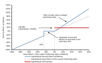 | Automatic Call: | If the closing level of the lowest performing Index on the call date is greater than or equal to its starting level, the securities will be automatically called, and on the call settlement date, investors will receive the principal amount plus the call premium. |