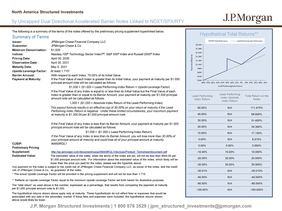 The following is a summary of the terms of the notes offered by the preliminary pricing supplement hyperlinked below. Summary of Terms Issuer: JPMorgan Chase Financial Company LLC Guarantor: JPMorgan Chase & Co. Minimum Denomination: $1,000 Indices: Nasdaq - 100 ® Technology Sector Index SM , S&P 500 ® Index and Russell 2000 ® Index Pricing Date: April 30, 2026 Observation Date: April 30, 2031 Maturity Date: May 5, 2031 Upside Leverage Factor: At least 1.715* Barrier Amount: With respect to each Index, 70.00% of its Initial Value Payment at Maturity: If the Final Value of each Index is greater than its Initial Value, your payment at maturity per $1,000 principal amount note will be calculated as follows: $1,000 + ($1,000 î Least Performing Index Return î Upside Leverage Factor) If the Final Value of any Index is equal to or less than its Initial Value but the Final Value of each Index is greater than or equal to its Barrier Amount, your payment at maturity per $1,000 principal amount note will be calculated as follows: 1,000 + ($1,000 î Absolute Index Return of the Least Performing Index) This payout formula results in an effective cap of 30.00% on your return at maturi ty if the Least Performing Index Return is negative. Under these limited circumstances, your maximum payment at maturity is $1,300.00 per $1,000 principal amount note. If the Final Value of any Index is less than its Barrier Amount, your payment at maturity per $1,000 principal amount note will be calculated as follows: $1,000 + ($1,000 x Least Performing Index Return) If the Final Value of any Index is less than its Barrier Amount, you will lose more than 30.00% of your principal amount at maturity and could lose all of your principal amount at maturity. CUSIP: 46660RQL1 Preliminary Pricing Supplement: http://sp.jpmorgan.com/document/cusip/46660RQL1/doctype/Product_Termsheet/document.pdf Estimated Value: The estimated value of the notes, when the terms of the notes are set, will not be less than $900.00 per $1,000 principal amount note. For information about the estimated value of the notes, which likely will be lower than the price you paid for the notes, please see the hyperlink above. Any payment on the notes is subject to the credit risk of JPMorgan Chase Financial Company LLC, as issuer of the notes, and t he credit risk of JPMorgan Chase & Co., as guarantor of the notes. * The actual Upside Leverage Factor will be provided in the pricing supplement and will not be less than 1.715. Hypothetical Total Returns** J.P. Morgan Structured Investments | 1 800 576 3529 | jpm_structured_investments@jpmorgan.com Total Return on the Notes Least Performing Index Absolute Index Return Least Performing Index Return 111.475% N/A 65.00% 68.600% N/A 40.00% 51.450% N/A 30.00% 34.300% N/A 20.00% 17.150% N/A 10.00% 8.575% N/A 5.00% 0.000% 0.00% 0.00% 10.000% 10.00% - 10.00% 20.000% 20.00% - 20.00% 30.000% 30.00% - 30.00% - 30.010% N/A - 30.01% - 40.000% N/A - 40.00% - 80.000% N/A - 80.00% - 100.000% N/A - 100.00% 5y Uncapped Dual Directional Accelerated Barrier Notes Linked to NDXT/SPX/RTY North America Structured Investments ** Reflects an Upside Leverage Factor equal to the minimum Upside Leverage Factor set forth herein for illustrative purposes. The “total return” as used above is the number, expressed as a percentage, that results from comparing the payment at maturit y per $1,000 principal amount note to $1,000. The hypothetical returns shown above apply only at maturity. These hypotheticals do not reflect fees or expenses that would b e associated with any sale in the secondary market. If these fees and expenses were included, the hypothetical returns shown above would likely be lower.