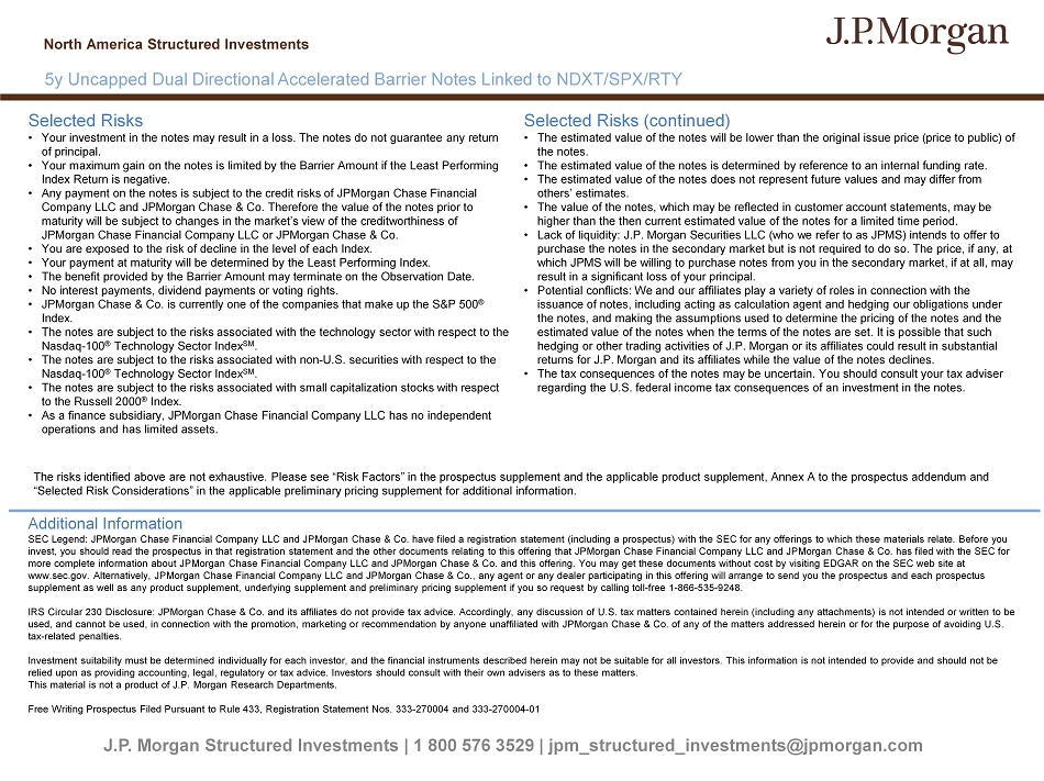 J.P. Morgan Structured Investments | 1 800 576 3529 | jpm_structured_investments@jpmorgan.com Selected Risks • Your investment in the notes may result in a loss. The notes do not guarantee any return of principal. • Your maximum gain on the notes is limited by the Barrier Amount if the Least Performing Index Return is negative. • Any payment on the notes is subject to the credit risks of JPMorgan Chase Financial Company LLC and JPMorgan Chase & Co. Therefore the value of the notes prior to maturity will be subject to changes in the market’s view of the creditworthiness of JPMorgan Chase Financial Company LLC or JPMorgan Chase & Co. • You are exposed to the risk of decline in the level of each Index. • Your payment at maturity will be determined by the Least Performing Index. • The benefit provided by the Barrier Amount may terminate on the Observation Date. • No interest payments, dividend payments or voting rights. • JPMorgan Chase & Co. is currently one of the companies that make up the S&P 500 ® Index. • The notes are subject to the risks associated with the technology sector with respect to the Nasdaq - 100 ® Technology Sector Index SM . • The notes are subject to the risks associated with non - U.S. securities with respect to the Nasdaq - 100 ® Technology Sector Index SM . • The notes are subject to the risks associated with small capitalization stocks with respect to the Russell 2000 ® Index . • As a finance subsidiary, JPMorgan Chase Financial Company LLC has no independent operations and has limited assets. Selected Risks (continued) • The estimated value of the notes will be lower than the original issue price (price to public) of the notes. • The estimated value of the notes is determined by reference to an internal funding rate. • The estimated value of the notes does not represent future values and may differ from others’ estimates. • The value of the notes, which may be reflected in customer account statements, may be higher than the then current estimated value of the notes for a limited time period. • Lack of liquidity: J.P. Morgan Securities LLC (who we refer to as JPMS) intends to offer to purchase the notes in the secondary market but is not required to do so. The price, if any, at which JPMS will be willing to purchase notes from you in the secondary market, if at all, may result in a significant loss of your principal. • Potential conflicts: We and our affiliates play a variety of roles in connection with the issuance of notes, including acting as calculation agent and hedging our obligations under the notes, and making the assumptions used to determine the pricing of the notes and the estimated value of the notes when the terms of the notes are set. It is possible that such hedging or other trading activities of J.P. Morgan or its affiliates could result in substantial returns for J.P. Morgan and its affiliates while the value of the notes declines. • The tax consequences of the notes may be uncertain. You should consult your tax adviser regarding the U.S. federal income tax consequences of an investment in the notes. Additional Information SEC Legend: JPMorgan Chase Financial Company LLC and JPMorgan Chase & Co. have filed a registration statement (including a pr osp ectus) with the SEC for any offerings to which these materials relate. Before you invest, you should read the prospectus in that registration statement and the other documents relating to this offering that JPM organ Chase Financial Company LLC and JPMorgan Chase & Co. has filed with the SEC for more complete information about JPMorgan Chase Financial Company LLC and JPMorgan Chase & Co. and this offering. You may get the se documents without cost by visiting EDGAR on the SEC web site at www.sec.gov. Alternatively, JPMorgan Chase Financial Company LLC and JPMorgan Chase & Co., any agent or any dealer participat ing in this offering will arrange to send you the prospectus and each prospectus supplement as well as any product supplement, underlying supplement and preliminary pricing supplement if you so request by c all ing toll - free 1 - 866 - 535 - 9248. IRS Circular 230 Disclosure: JPMorgan Chase & Co. and its affiliates do not provide tax advice. Accordingly, any discussion o f U .S. tax matters contained herein (including any attachments) is not intended or written to be used, and cannot be used, in connection with the promotion, marketing or recommendation by anyone unaffiliated with JPMorgan Cha se & Co. of any of the matters addressed herein or for the purpose of avoiding U.S. tax - related penalties. Investment suitability must be determined individually for each investor, and the financial instruments described herein may not be suitable for all investors. This information is not intended to provide and should not be relied upon as providing accounting, legal, regulatory or tax advice. Investors should consult with their own advisers as to the se matters. This material is not a product of J.P. Morgan Research Departments. Free Writing Prospectus Filed Pursuant to Rule 433, Registration Statement Nos. 333 - 270004 and 333 - 270004 - 01 5y Uncapped Dual Directional Accelerated Barrier Notes Linked to NDXT/SPX/RTY North America Structured Investments The risks identified above are not exhaustive. Please see “Risk Factors” in the prospectus supplement and the applicable prod uct supplement, Annex A to the prospectus addendum and “Selected Risk Considerations” in the applicable preliminary pricing supplement for additional information.