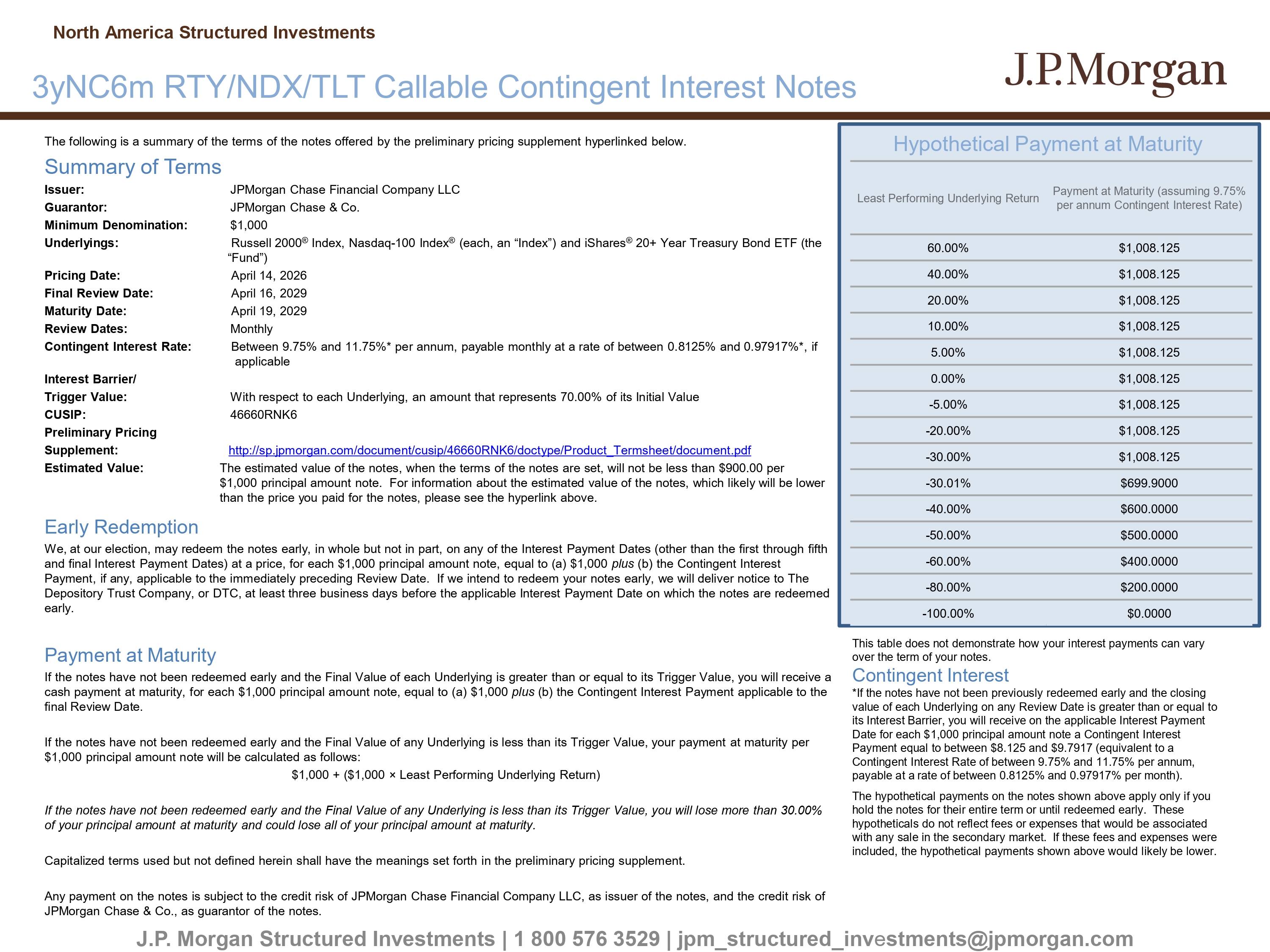 The following is a summary of the terms of the notes offered by the preliminary pricing supplement hyperlinked below. Summary of Terms Issuer: JPMorgan Chase Financial Company LLC Guarantor: JPMorgan Chase & Co. Minimum Denomination: $1,000 Underlyings : Russell 2000 ® Index, Nasdaq - 100 Index ® (each, an “Index”) and iShares ® 20+ Year Treasury Bond ETF (the “Fund”) Pricing Date: April 14, 2026 Final Review Date: April 16, 2029 Maturity Date: April 19, 2029 Review Dates: Monthly Contingent Interest Rate: Between 9.75% and 11.75%* per annum, payable monthly at a rate of between 0.8125% and 0.97917%*, if applicable Interest Barrier/ Trigger Value: With respect to each Underlying, an amount that represents 70.00% of its Initial Value CUSIP: 46660RNK6 Preliminary Pricing Supplement: http://sp.jpmorgan.com/document/cusip/46660RNK6/doctype/Product_Termsheet/document.pdf Estimated Value: The estimated value of the notes, when the terms of the notes are set, will not be less than $900.00 per $1,000 principal amount note. For information about the estimated value of the notes, which likely will be lower than the price you paid for the notes, please see the hyperlink above. Early Redemption We, at our election, may redeem the notes early, in whole but not in part, on any of the Interest Payment Dates (other than t he first through fifth and final Interest Payment Dates) at a price, for each $1,000 principal amount note, equal to (a) $1,000 plus (b) the Contingent Interest Payment, if any, applicable to the immediately preceding Review Date. If we intend to redeem your notes early, we will deliv er notice to The Depository Trust Company, or DTC, at least three business days before the applicable Interest Payment Date on which the notes ar e redeemed early. Payment at Maturity If the notes have not been redeemed early and the Final Value of each Underlying is greater than or equal to its Trigger Valu e, you will receive a cash payment at maturity, for each $1,000 principal amount note, equal to (a) $1,000 plus (b) the Contingent Interest Payment applicable to the final Review Date. If the notes have not been redeemed early and the Final Value of any Underlying is less than its Trigger Value, your payment at maturity per $1,000 principal amount note will be calculated as follows: $1,000 + ($1,000 î Least Performing Underlying Return) If the notes have not been redeemed early and the Final Value of any Underlying is less than its Trigger Value, you will lose mo re than 30.00% of your principal amount at maturity and could lose all of your principal amount at maturity. Capitalized terms used but not defined herein shall have the meanings set forth in the preliminary pricing supplement. Any payment on the notes is subject to the credit risk of JPMorgan Chase Financial Company LLC, as issuer of the notes, and t he credit risk of JPMorgan Chase & Co., as guarantor of the notes. Hypothetical Payment at Maturity J.P. Morgan Structured Investments | 1 800 576 3529 | jpm_structured_inv e stments@jpmorgan.com 3yNC6m RTY/NDX/TLT Callable Contingent Interest Notes North America Structured Investments Payment at Maturity (assuming 9.75% per annum Contingent Interest Rate) Least Performing Underlying Return $1,008.125 60.00% $1,008.125 40.00% $1,008.125 20.00% $1,008.125 10.00% $1,008.125 5.00% $1,008.125 0.00% $1,008.125 - 5.00% $1,008.125 - 20.00% $1,008.125 - 30.00% $699.9000 - 30.01% $600.0000 - 40.00% $500.0000 - 50.00% $400.0000 - 60.00% $200.0000 - 80.00% $0.0000 - 100.00% This table does not demonstrate how your interest payments can vary over the term of your notes. Contingent Interest *If the notes have not been previously redeemed early and the closing value of each Underlying on any Review Date is greater than or equal to its Interest Barrier, you will receive on the applicable Interest Payment Date for each $1,000 principal amount note a Contingent Interest Payment equal to between $8.125 and $9.7917 (equivalent to a Contingent Interest Rate of between 9.75% and 11.75% per annum, payable at a rate of between 0.8125% and 0.97917% per month). The hypothetical payments on the notes shown above apply only if you hold the notes for their entire term or until redeemed early. These hypotheticals do not reflect fees or expenses that would be associated with any sale in the secondary market. If these fees and expenses were included, the hypothetical payments shown above would likely be lower.