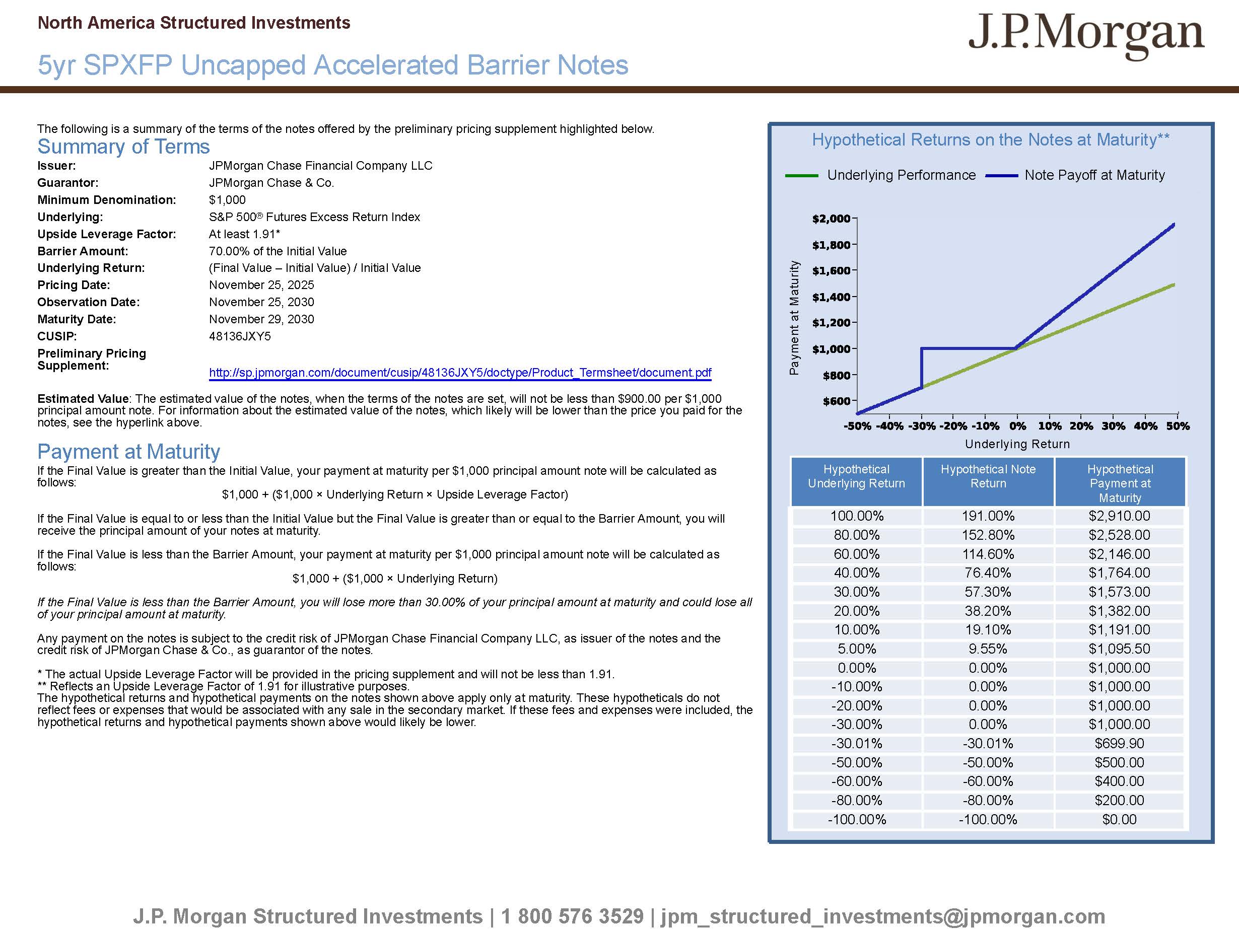 North America Structured Investments 5yr SPXFP Uncapped Accelerated Barrier Notes J.P. Morgan Structured Investments | 1 800 576 3529 | jpm_structured_investments@jpmorgan.com The following is a summary of the terms of the notes offered by the preliminary pricing supplement highlighted below. Summary of Terms Issuer: JPMorgan Chase Financial Company LLC Guarantor: JPMorgan Chase & Co. Minimum Denomination: $1,000 Underlying: S&P 500® Futures Excess Return Index Upside Leverage Factor: At least 1.91* Barrier Amount: 70.00% of the Initial Value Underlying Return: (Final Value – Initial Value) / Initial Value Pricing Date: November 25, 2025 Observation Date: November 25, 2030 Maturity Date: November 29, 2030 CUSIP: 48136JXY5 Preliminary Pricing Supplement: http://sp.jpmorgan.com/document/cusip/48136JXY5/doctype/Product_Termsheet/document.pdf Estimated Value: The estimated value of the notes, when the terms of the notes are set, will not be less than $900.00 per $1,000 principal amount note. For information about the estimated value of the notes, which likely will be lower than the price you paid for the notes, see the hyperlink above. Payment at Maturity If the Final Value is greater than the Initial Value, your payment at maturity per $1,000 principal amount note will be calculated as follows: $1,000 + ($1,000 × Underlying Return × Upside Leverage Factor) If the Final Value is equal to or less than the Initial Value but the Final Value is greater than or equal to the Barrier Amount, you will receive the principal amount of your notes at maturity. If the Final Value is less than the Barrier Amount, your payment at maturity per $1,000 principal amount note will be calculated as follows: $1,000 + ($1,000 × Underlying Return) If the Final Value is less than the Barrier Amount, you will lose more than 30.00% of your principal amount at maturity and could lose all of your principal amount at maturity. Any payment on the notes is subject to the credit risk of JPMorgan Chase Financial Company LLC, as issuer of the notes and the credit risk of JPMorgan Chase & Co., as guarantor of the notes. * The actual Upside Leverage Factor will be provided in the pricing supplement and will not be less than 1.91. ** Reflects an Upside Leverage Factor of 1.91 for illustrative purposes. The hypothetical returns and hypothetical payments on the notes shown above apply only at maturity. These hypotheticals do not reflect fees or expenses that would be associated with any sale in the secondary market. If these fees and expenses were included, the hypothetical returns and hypothetical payments shown above would likely be lower. Hypothetical Returns on the Notes at Maturity** Underlying Performance Note Payoff at Maturity Payment at Maturity Underlying Return Hypothetical Underlying Return Hypothetical Note Return Hypothetical Payment at Maturity 100.00% 191.00% $2,910.00 80.00% 152.80% $2,528.00 60.00% 114.60% $2,146.00 40.00% 76.40% $1,764.00 30.00% 57.30% $1,573.00 20.00% 38.20% $1,382.00 10.00% 19.10% $1,191.00 5.00% 9.55% $1,095.50 0.00% 0.00% $1,000.00 -10.00% 0.00% $1,000.00 -20.00% 0.00% $1,000.00 -30.00% 0.00% $1,000.00 -30.01% -30.01% $699.90 -50.00% -50.00% $500.00 -60.00% -60.00% $400.00 -80.00% -80.00% $200.00 -100.00% -100.00% $0.00